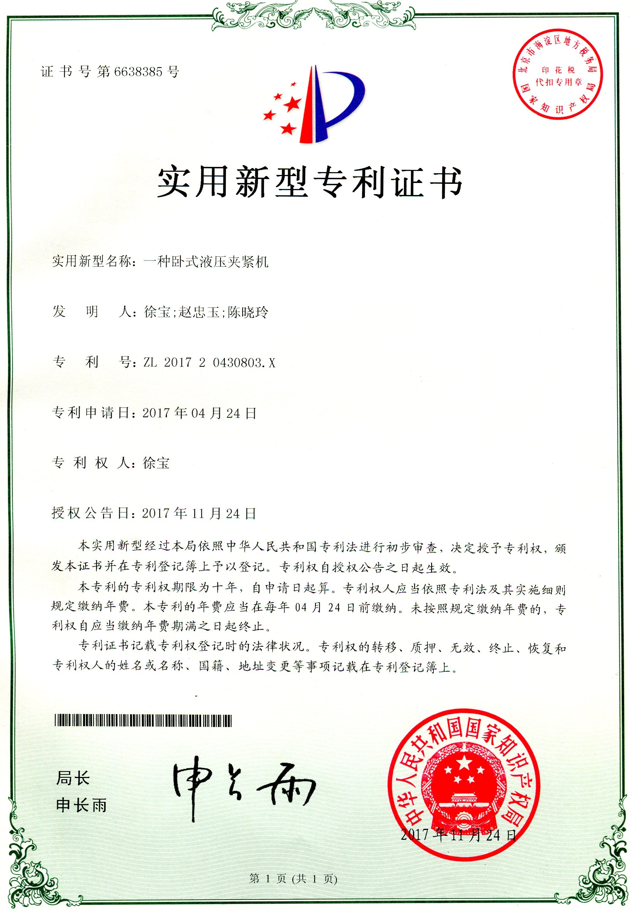 科研成果---實用新型專利:一種臥式液壓夾緊機