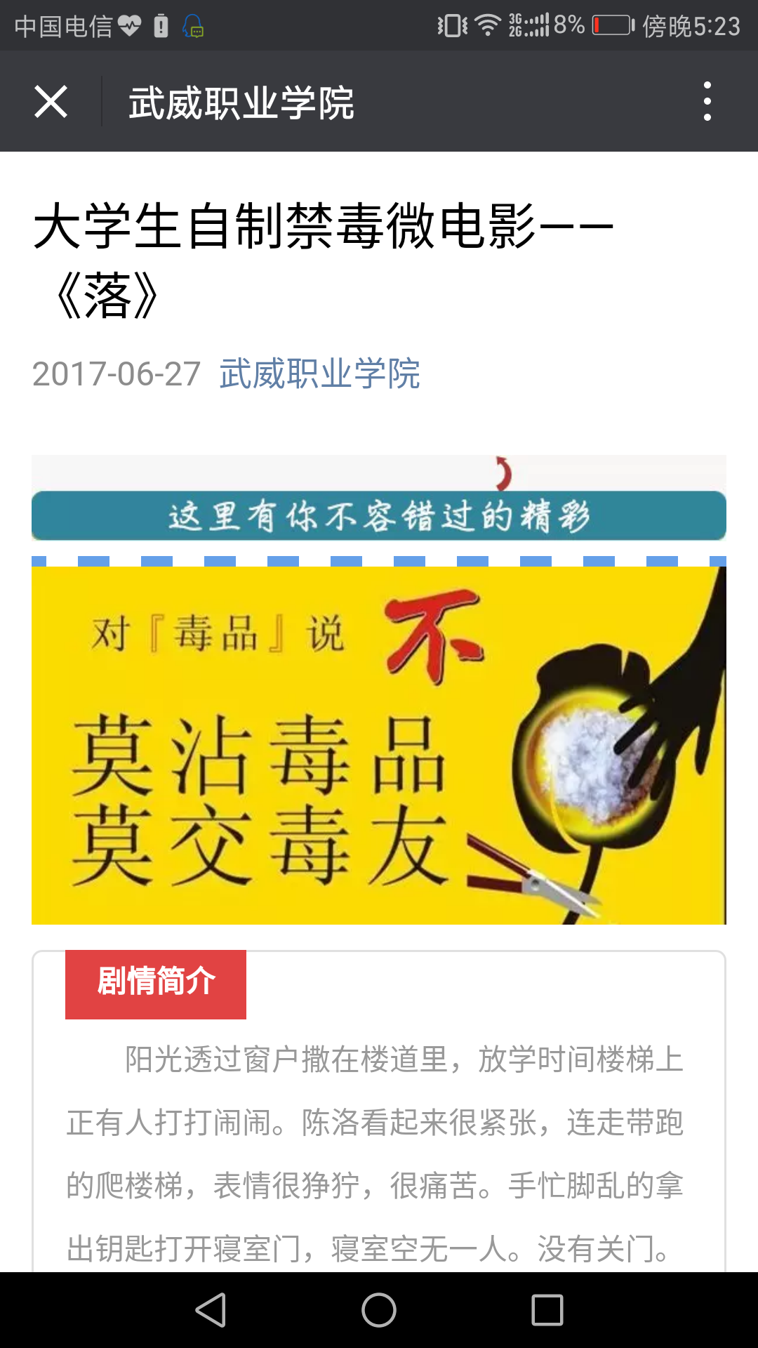 為進(jìn)一步推進(jìn)平安校園建設(shè),不斷推進(jìn)青少年毒品預(yù)防教育“6·27”工程活動的深入開展,增強(qiáng)師生的禁毒意識,武威職業(yè)學(xué)院根據(jù)甘肅省禁毒委員會辦公室、甘肅省教育廳《關(guān)于做好2017年秋季開學(xué)在校學(xué)生毒品預(yù)防教育工作的通知》要求,在全院范圍內(nèi)開展了禁毒宣傳教育“五個(gè)一”活動。