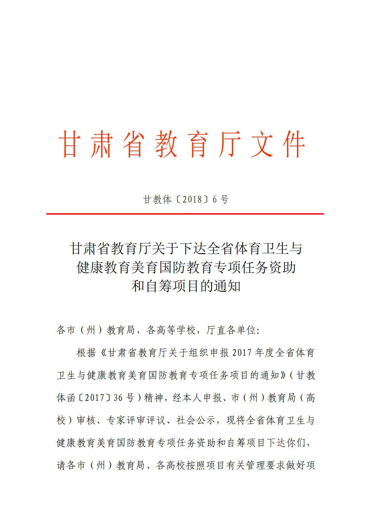 甘肅省教育廳關(guān)于下達全省體育衛(wèi)生與健康教育美育國防教育專項任務(wù)資助和自籌項目的通知-正文