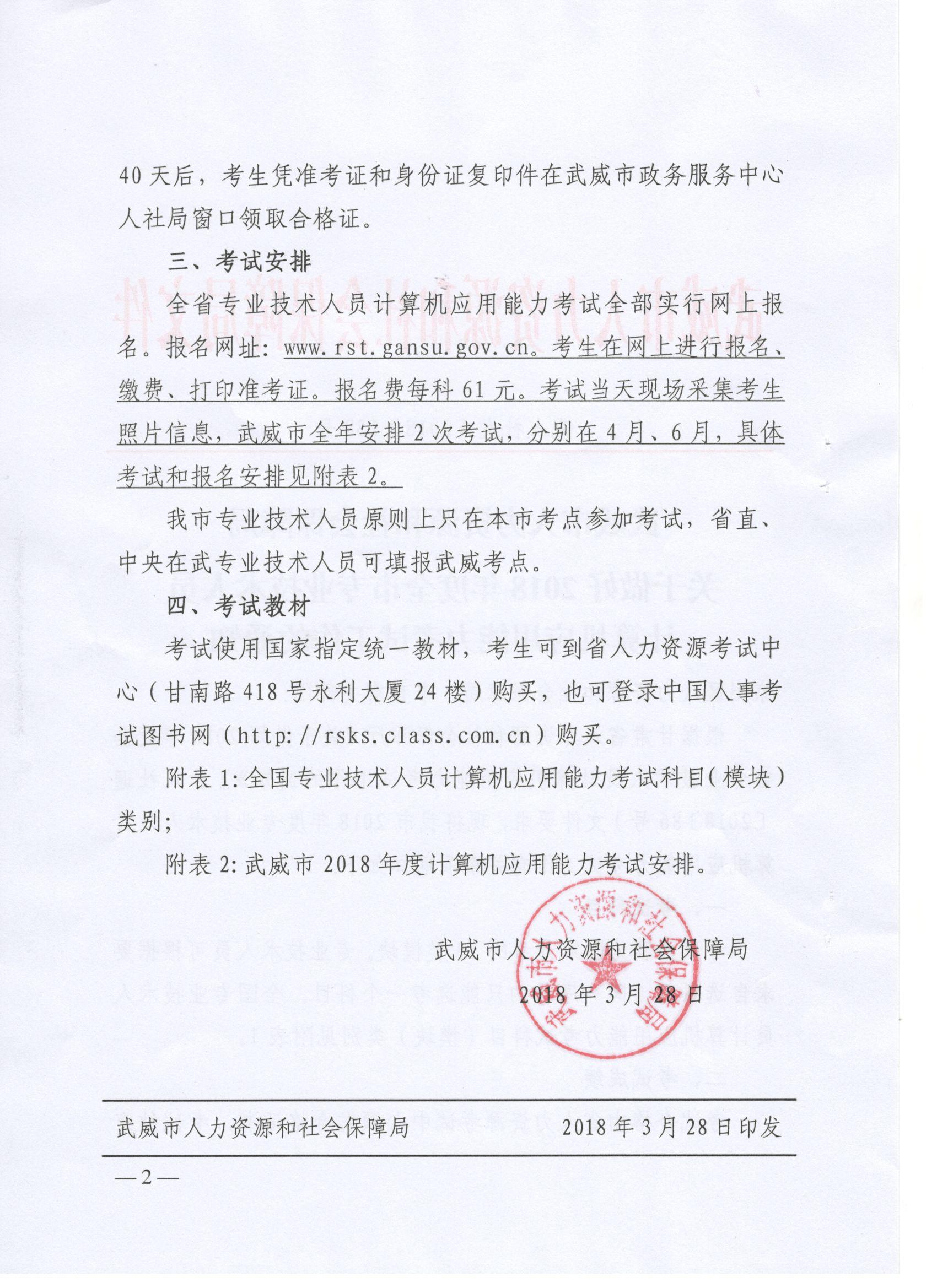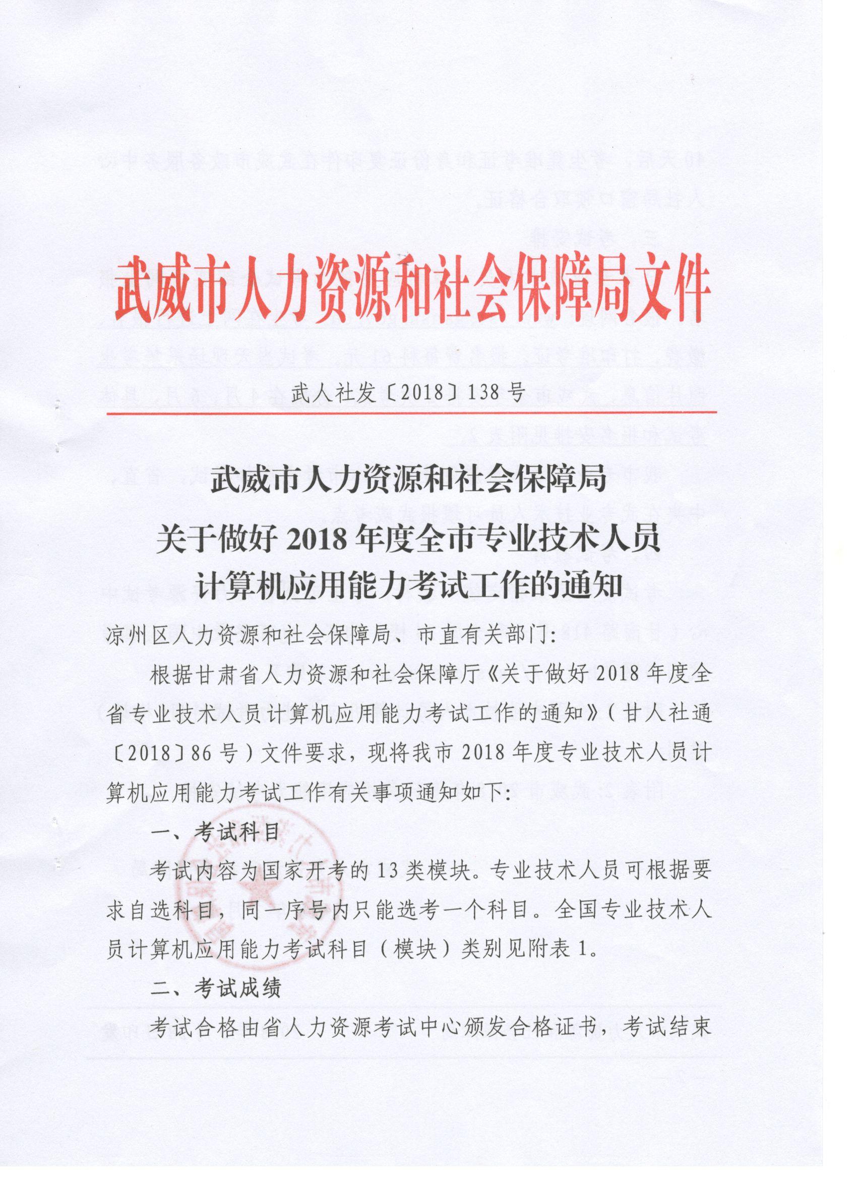 <轉(zhuǎn)>武威市人力資源和社會保障局關(guān)于做好2018年度全市專業(yè)技術(shù)人員計算機(jī)應(yīng)用能力考試工作的通知(武人社發(fā)〔2018〕138號 )