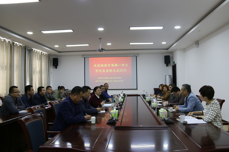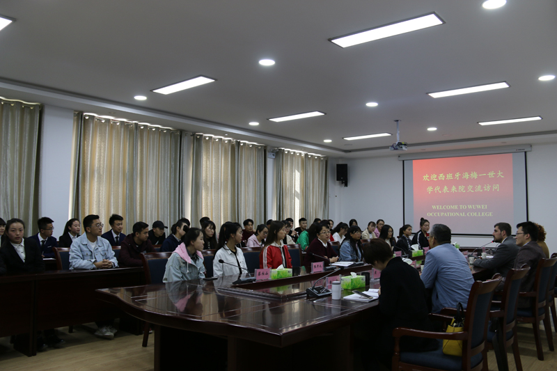 座談會上,田迎春代表全院師生對海梅一世大學(xué)到訪學(xué)院表示歡迎,對省國際交流與合作服務(wù)中心對學(xué)院的關(guān)心表示感謝,并向來訪客人簡要介紹了武威文化歷史、學(xué)院建設(shè)發(fā)展情況、學(xué)院國際交流與合作開展情況。來訪客人對學(xué)院近年來的巨大發(fā)展表示贊賞,對學(xué)院國際交流與合作開展工作表示肯定。Ana女士通過PPT展示介紹了海梅一世大學(xué),希望雙方進(jìn)一步進(jìn)行合作。賓主雙方還就校際交流、語言培訓(xùn)、赴西班牙專升碩留學(xué)項目等共同關(guān)心的問題進(jìn)行了深入交流。