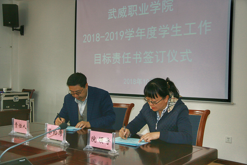 責(zé)任書簽訂儀式上,田迎春代表學(xué)院與各系黨總支書記或負(fù)責(zé)人簽訂了《武威職業(yè)學(xué)院2018-2019學(xué)年度學(xué)生工作目標(biāo)責(zé)任書》。她充分肯定了各系2017-2018學(xué)年的學(xué)生工作,并就我院學(xué)生工作提出了具體要求,一是學(xué)生工作要緊緊圍繞“立德樹人”的根本任務(wù),樹立全院全員育人思想,各系要強(qiáng)化學(xué)生工作管理責(zé)任,增強(qiáng)工作主動(dòng)性和責(zé)任性,使學(xué)生管理的各項(xiàng)工作更細(xì)、更實(shí);二是各系要在學(xué)生思想政治教育和日常管理工作中堅(jiān)持誰主管誰負(fù)責(zé)的原則,力求做到“工作規(guī)范化、管理精細(xì)化、服務(wù)人性化”;三是各系及學(xué)工部門在思想上要與學(xué)院保持高度一致,在工作落實(shí)上與學(xué)院保持相向而行,切實(shí)將目標(biāo)責(zé)任書的承諾轉(zhuǎn)化為抓工作、謀發(fā)展、促改革的具體行動(dòng);四是要在就業(yè)創(chuàng)業(yè)上下功夫,促進(jìn)畢業(yè)生就業(yè)率有所提高、就業(yè)質(zhì)量不斷上升;五是各系要繼續(xù)發(fā)揚(yáng)勇于創(chuàng)新、開拓進(jìn)取的精神,以更飽滿的熱情、更昂揚(yáng)的斗志、更務(wù)實(shí)的作風(fēng)推進(jìn)我院學(xué)生管理工作的科學(xué)發(fā)展。