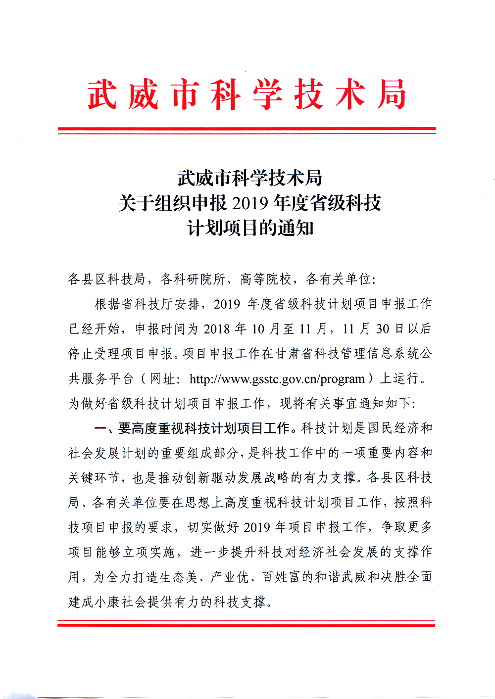 轉(zhuǎn)發(fā)武威市科學技術局關于組織申報2019年度省級科技計劃項目的通知