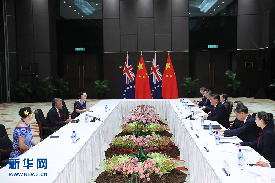 11月16日,國家主席習近平在莫爾茲比港分別會見建交太平洋島國領導人。這是習近平會見紐??偫硭?。 新華社記者 丁林 攝