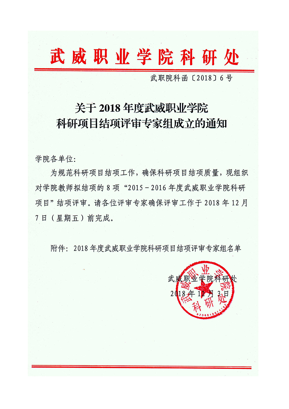 關于2018年度武威職業(yè)學院科研項目結項評審專家組成立的通知