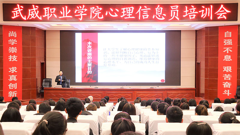 12月4日晚上,學(xué)生工作處聯(lián)合武威市“三社聯(lián)動(dòng)”惠政社區(qū)試點(diǎn)項(xiàng)目在學(xué)院菁英廳舉辦了心理健康專題講座暨心理信息員培訓(xùn)。此次講座邀請武威市心理咨詢師協(xié)會(huì)會(huì)長何飛老師主講,學(xué)院各系輔導(dǎo)員、2017級(jí)、2018級(jí)班級(jí)心理信息員、心翼心理社團(tuán)會(huì)員等220多人聆聽了講座。學(xué)生工作處處長王守云主持活動(dòng)。