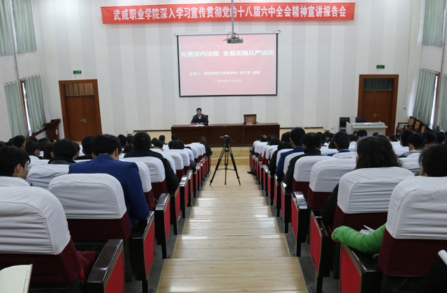 為全面準(zhǔn)確學(xué)習(xí)宣傳黨的十八屆六中全會(huì)精神,12月9日上午,學(xué)院在尚德樓正德廳舉辦“深入學(xué)習(xí)宣傳貫徹黨的十八屆六中全會(huì)精神宣講報(bào)告會(huì)”,邀請(qǐng)西北師范大學(xué)教授李玉璧作題為《完善黨內(nèi)法規(guī) 全面實(shí)施從嚴(yán)治黨》的宣講報(bào)告。學(xué)院副院長(zhǎng)王永緒、潘玉華、田迎春,中層干部及師生代表200余人參加報(bào)告會(huì)。田迎春主持宣講報(bào)告會(huì)。