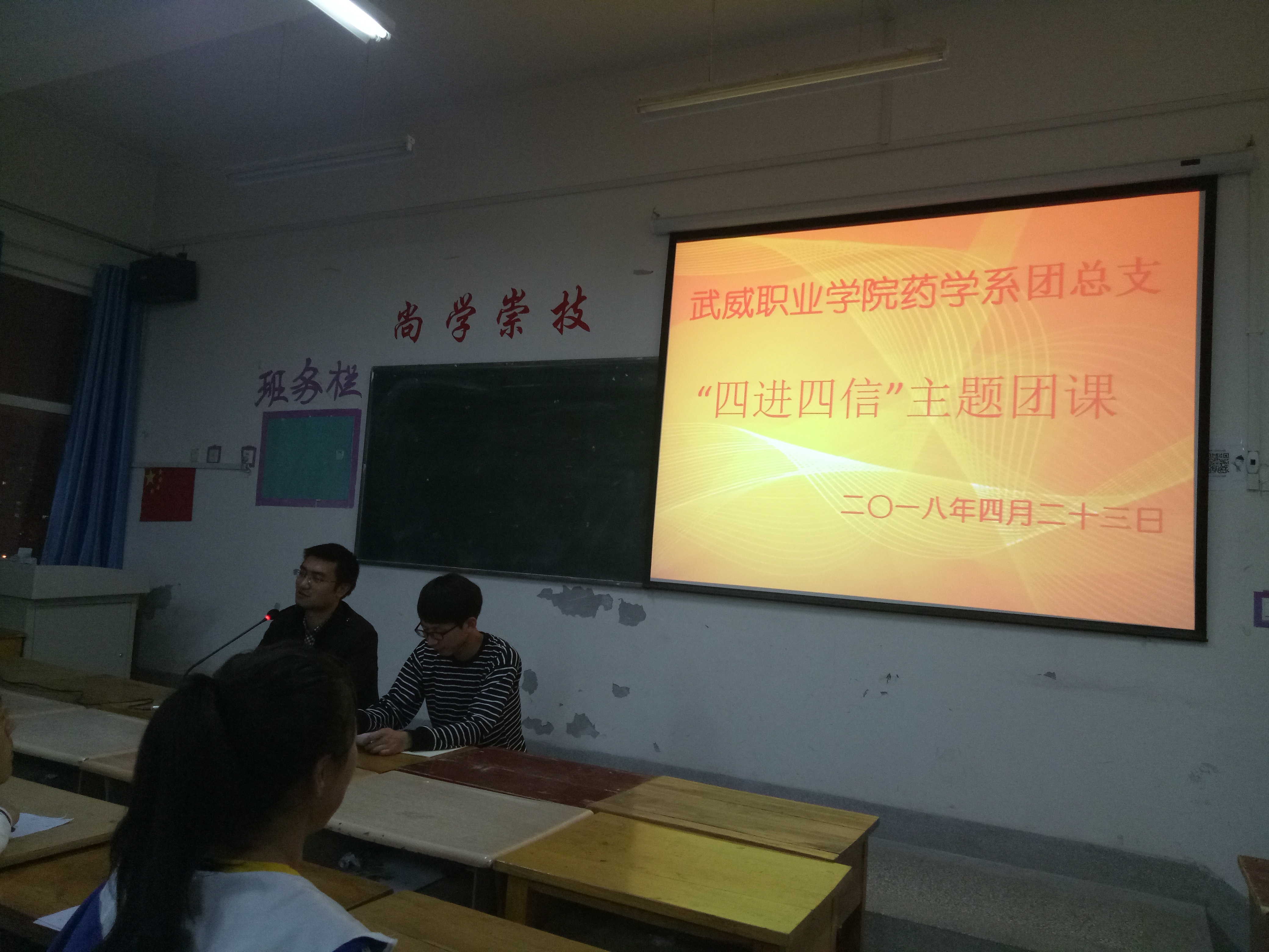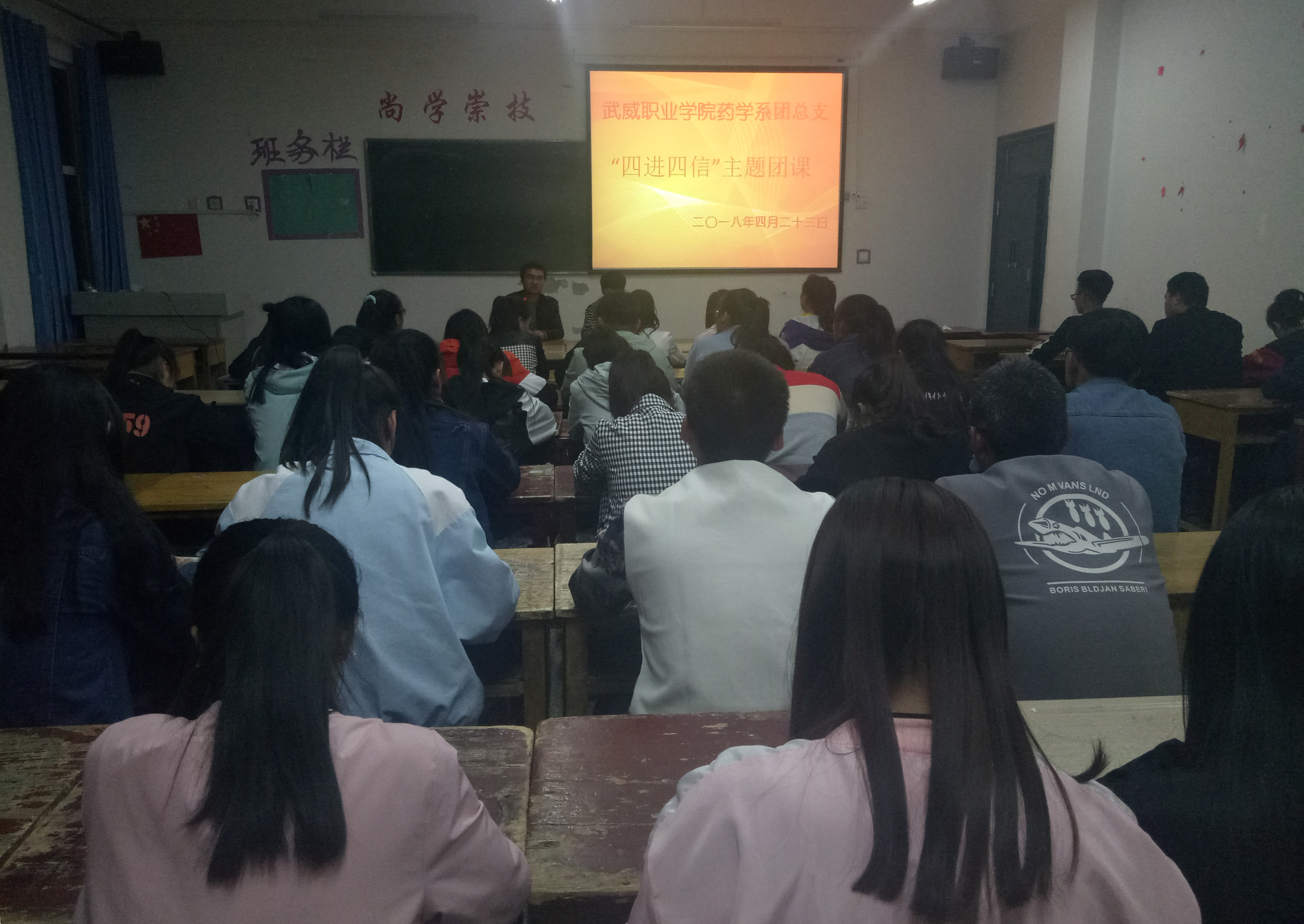 為深入學(xué)習(xí)宣傳貫徹習(xí)近平新時代中國特色社會主義思想,堅持以習(xí)近平新時代中國特色社會主義思想武裝團員干部和團員青年學(xué)生頭腦,積極推進各項工作開展。2018年4月23日晚,藥學(xué)系團總支組織16級團員青年及17級入團積極分子在明遠(yuǎn)樓501教室開展關(guān)于“四進四信”的主題團課活動,團課由系團總支書記陳輝生主持。