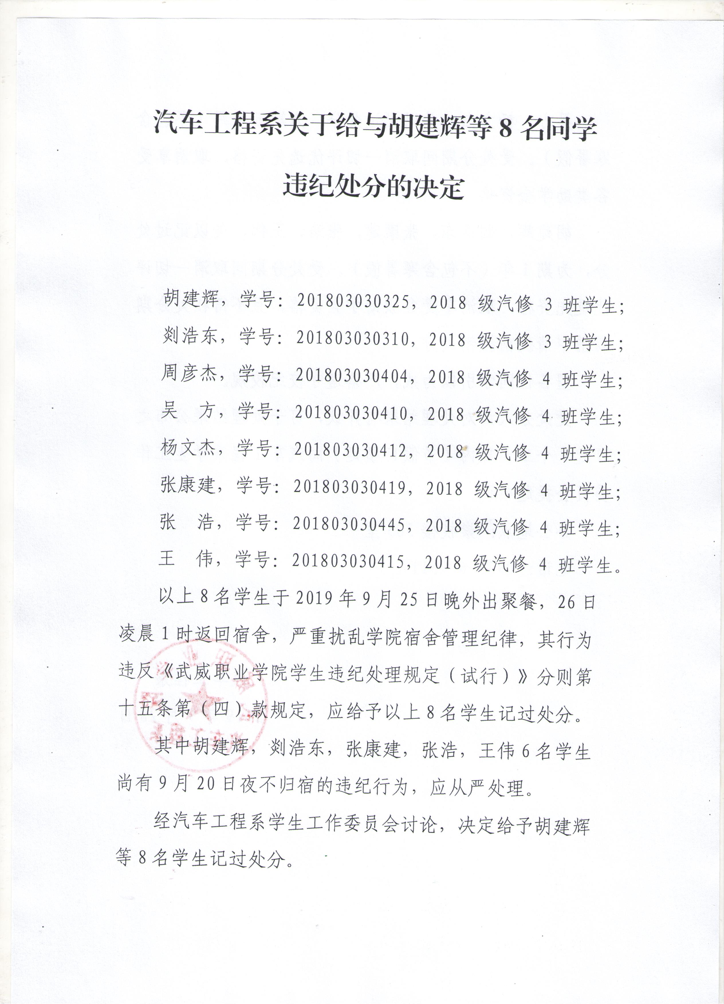 汽車工程系關于給與胡建輝等8名同學違紀處分的決定