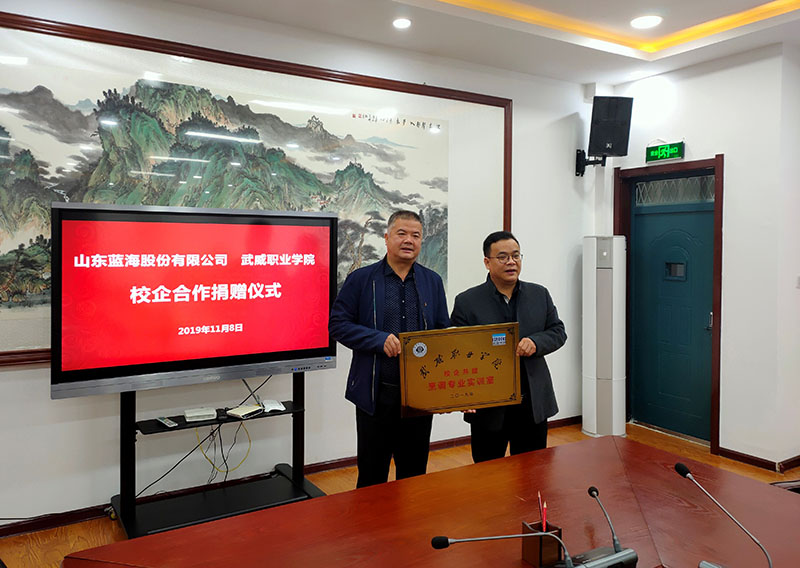 在捐贈(zèng)儀式上,楊兆永總經(jīng)理介紹了山東藍(lán)海股份有限公司做了介紹,雙方在人才需求、專業(yè)課程設(shè)置開發(fā)、雙師型師資培養(yǎng)、教學(xué)組織實(shí)習(xí)質(zhì)量評(píng)估、就業(yè)服務(wù)等多方面合作近十年,已經(jīng)將校企雙方緊密聯(lián)合在一起,同時(shí)希望今后繼續(xù)不斷在師資隊(duì)伍培養(yǎng)、人才培養(yǎng)、教育教學(xué)繼續(xù)加強(qiáng)合作,實(shí)現(xiàn)雙贏,共同發(fā)展。