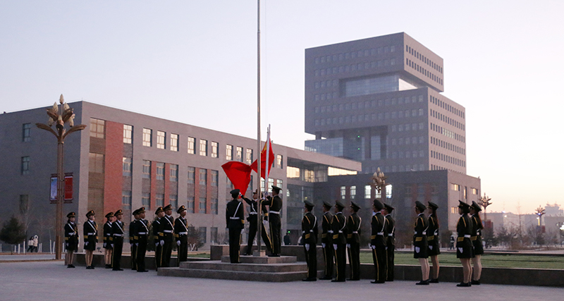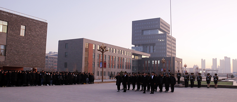 上午7時50分,國旗班踏著鏗鏘有力的步伐步入升旗臺,鮮紅的五星紅旗在雄壯的國歌聲中冉冉升起。警笛鳴響,在場師生肅立,為遇難同胞默哀致敬。26名學生代表深情朗誦《和平宣言》,代表學院全體師生發(fā)出莊嚴的和平宣言。