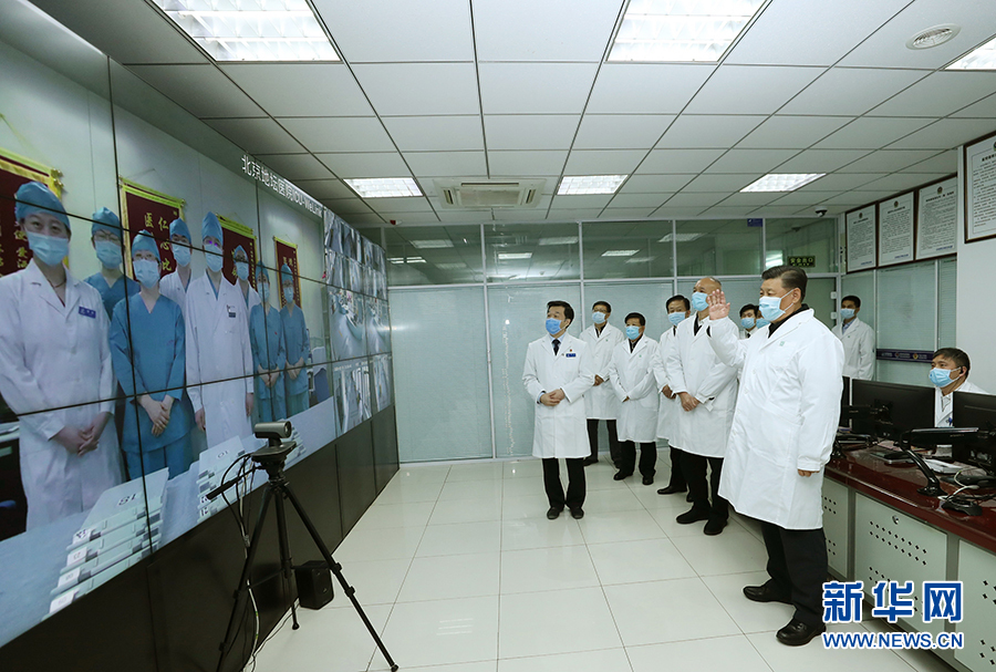 2月10日,中共中央總書記、國家主席、中央軍委主席習(xí)近平在北京調(diào)研指導(dǎo)新冠肺炎疫情防控工作。這是習(xí)近平來到首都醫(yī)科大學(xué)附屬北京地壇醫(yī)院門診樓一層運(yùn)行監(jiān)控中心,通過監(jiān)控畫面察看患者住院診療情況,并視頻連線正在病房值班的醫(yī)務(wù)人員。 新華社記者 鞠鵬 攝