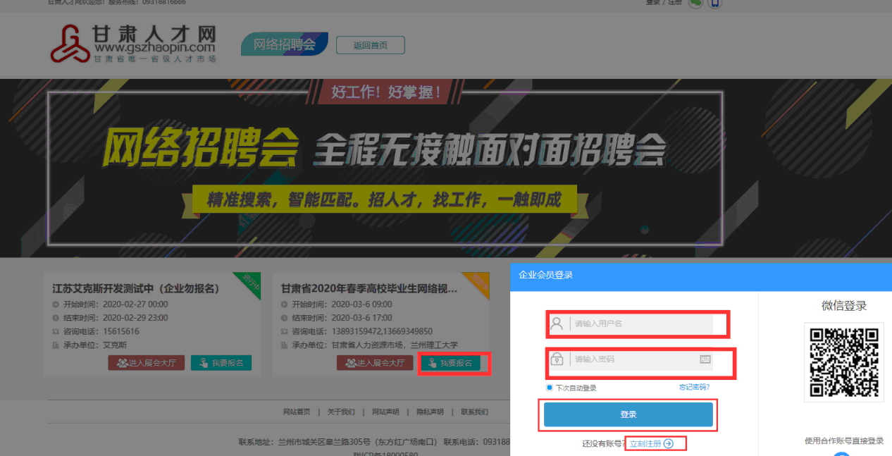 1.登錄甘肅人才網(wǎng)(www.gszhaopin.com),點(diǎn)擊菜單欄“招聘會(huì)”—“網(wǎng)絡(luò)招聘會(huì)”進(jìn)入二級(jí)頁(yè)面菜單,進(jìn)入網(wǎng)絡(luò)招聘會(huì)列表—選擇“武威職業(yè)學(xué)院2020屆醫(yī)藥衛(wèi)生類畢業(yè)生網(wǎng)絡(luò)視頻雙選會(huì)”點(diǎn)擊“我要報(bào)名”按鈕,登錄企業(yè)后臺(tái)(無(wú)賬號(hào)點(diǎn)擊“立即注冊(cè)”,資質(zhì)通過審核后再報(bào)名),待定審核。
