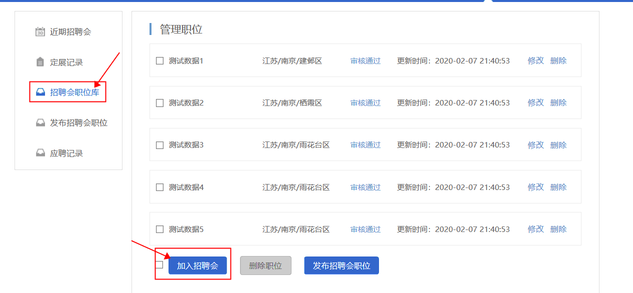 2.企業(yè)通過后臺(tái)中心“網(wǎng)絡(luò)招聘會(huì)”欄目——點(diǎn)擊發(fā)布招聘會(huì)職位(等待審核)——審核通過后,將“招聘會(huì)職位庫(kù)”中的職位加入到“武威職業(yè)學(xué)院2020屆醫(yī)藥衛(wèi)生類畢業(yè)生網(wǎng)絡(luò)視頻雙選會(huì)”,職位將在網(wǎng)絡(luò)招聘大廳中進(jìn)行展示。