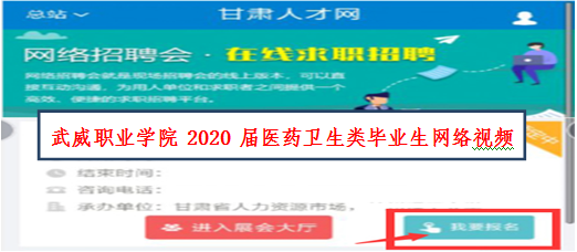 1.手機(jī)瀏覽器搜索甘肅人才網(wǎng)或輸入網(wǎng)址(www.gszhaopin.com),進(jìn)入網(wǎng)站首頁(yè)點(diǎn)擊“網(wǎng)絡(luò)招聘會(huì)”,——選擇“武威職業(yè)學(xué)院2020屆醫(yī)藥衛(wèi)生類畢業(yè)生網(wǎng)絡(luò)視頻雙選會(huì)”點(diǎn)擊“我要報(bào)名”按鈕,登錄企業(yè)后臺(tái)(無(wú)賬號(hào)點(diǎn)擊“立即注冊(cè)”,資質(zhì)通過審核后再報(bào)名),待定審核。