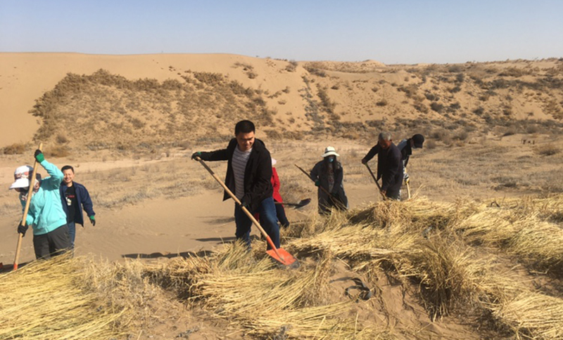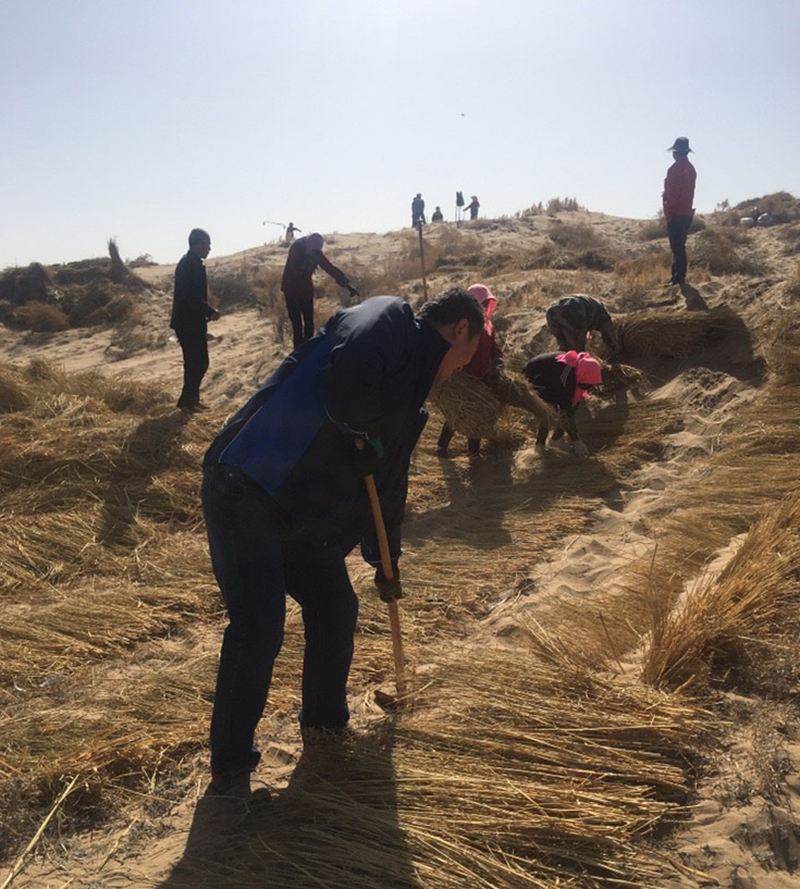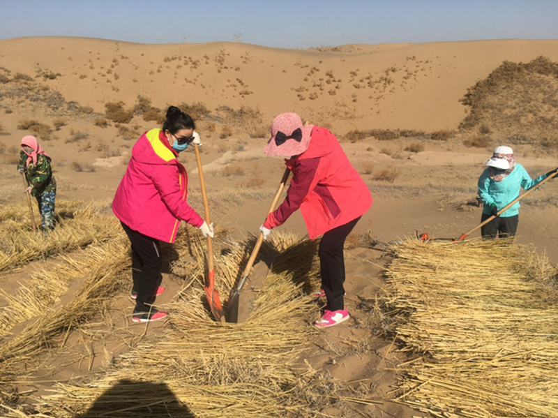 全體壓沙人員不怕吃苦、不怕流汗,爭先恐后投入壓沙勞動中。分工合作,有的開溝,有的鋪草,有的壓沙,整齊的麥草方格由一排排向一片片不斷延伸,一個個沙丘逐漸被麥草網格牢牢鎖住。