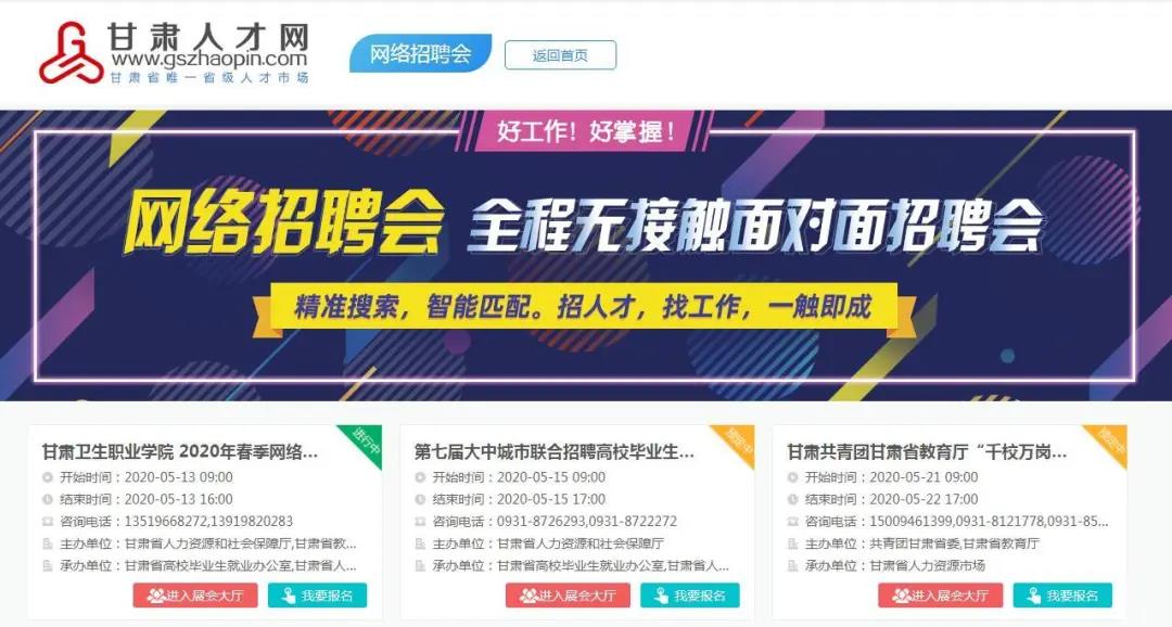 為應(yīng)對新冠肺炎疫情沖擊,加大高校畢業(yè)生就業(yè)服務(wù)力度,進(jìn)一步做好高校畢業(yè)生就業(yè)服務(wù)工作,甘肅省高校畢業(yè)生就業(yè)辦公室、甘肅省人力資源市場定于2020年5月15日聯(lián)合甘肅省內(nèi)部分高校在甘肅人才網(wǎng)(www.gszhaopin.com)舉辦“第七屆大中城市聯(lián)合招聘高校畢業(yè)生春季網(wǎng)絡(luò)視頻專場招聘會(huì)‘甘肅站’”活動(dòng)。