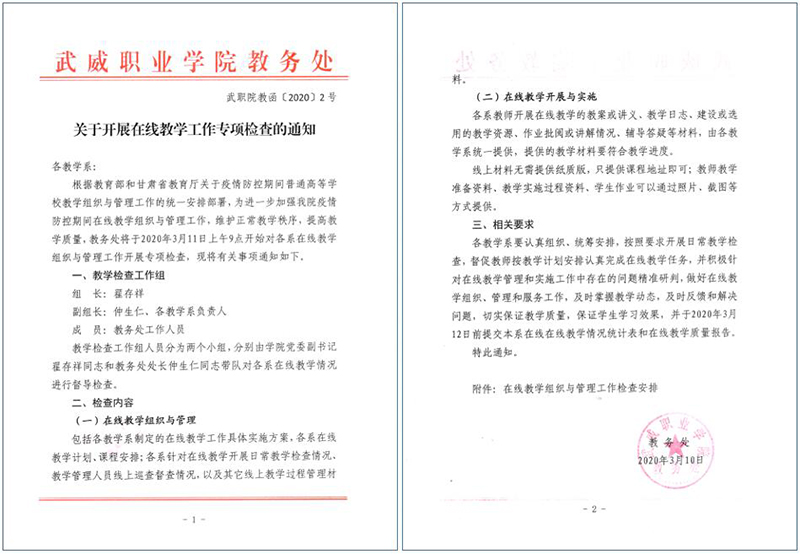 各院系及相關(guān)部門(mén)要按照教育部和省教育廳關(guān)于疫情防控期間在線教學(xué)工作的文件精神和《武威職業(yè)學(xué)院新型冠狀病毒肺炎疫情防控期間在線教學(xué)工作實(shí)施方案》的相關(guān)要求進(jìn)行全面自查,做到文件精神及要求全部落實(shí)到位、不打折扣;對(duì)執(zhí)行情況進(jìn)行認(rèn)真總結(jié),通過(guò)自查深入挖掘現(xiàn)階段在線教學(xué)實(shí)施和組織管理過(guò)程中的重點(diǎn)問(wèn)題,利用各系教研活動(dòng)和教研團(tuán)隊(duì)推動(dòng)開(kāi)展教學(xué)研究和人才培養(yǎng)模式改革研究,全面落實(shí)問(wèn)題導(dǎo)向,推動(dòng)在線教學(xué)工作落實(shí)落細(xì)落地。