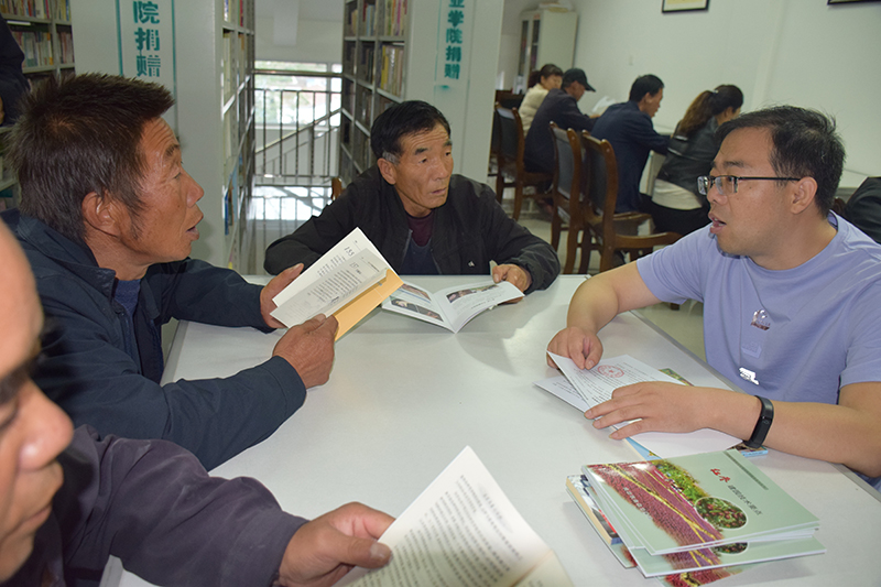“扶貧先扶智”,晏素珍帶領(lǐng)黨員教師為黑松驛鎮(zhèn)的農(nóng)戶贈送了種植養(yǎng)殖及產(chǎn)業(yè)扶貧結(jié)合密切的圖書,之后來到了圖書閱覽室共同交流研討種植養(yǎng)殖的技術(shù)問題,同時還召開了座談會,就農(nóng)戶急需解決的問題進行了詳細(xì)的講解。