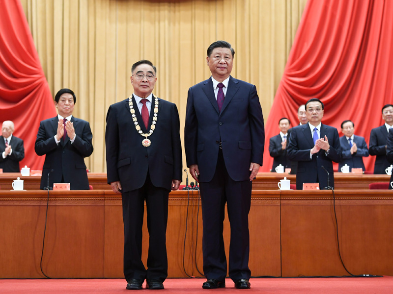 栗戰(zhàn)書宣讀習(xí)近平簽署的中華人民共和國主席令。主席令指出,為了隆重表彰在抗擊新冠肺炎疫情斗爭中作出杰出貢獻(xiàn)的功勛模范人物,弘揚(yáng)他們忠誠、擔(dān)當(dāng)、奉獻(xiàn)的崇高品質(zhì),根據(jù)第十三屆全國人民代表大會(huì)常務(wù)委員會(huì)第二十一次會(huì)議的決定,授予鐘南山“共和國勛章”,授予張伯禮、張定宇、陳薇“人民英雄”國家榮譽(yù)稱號。