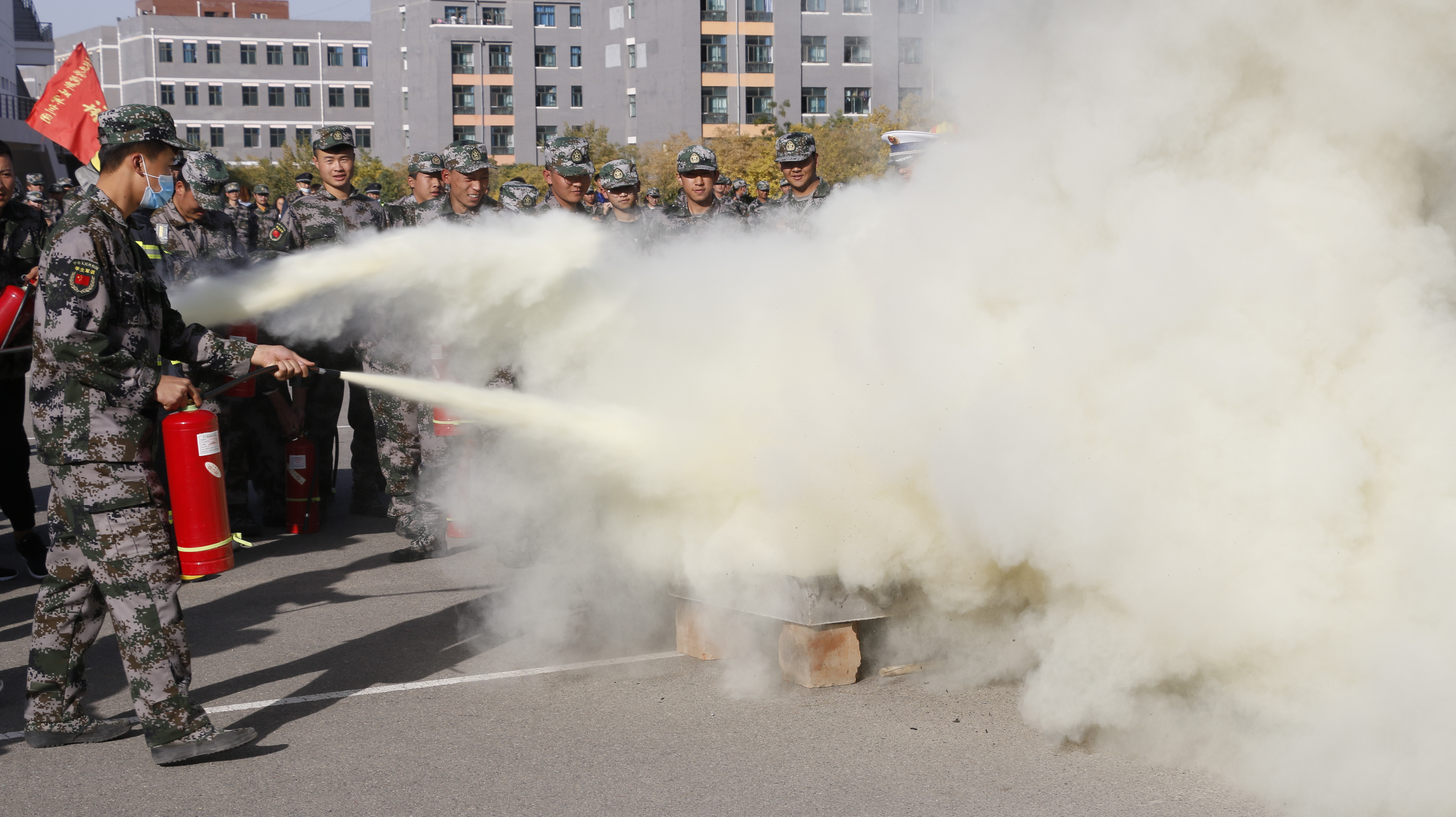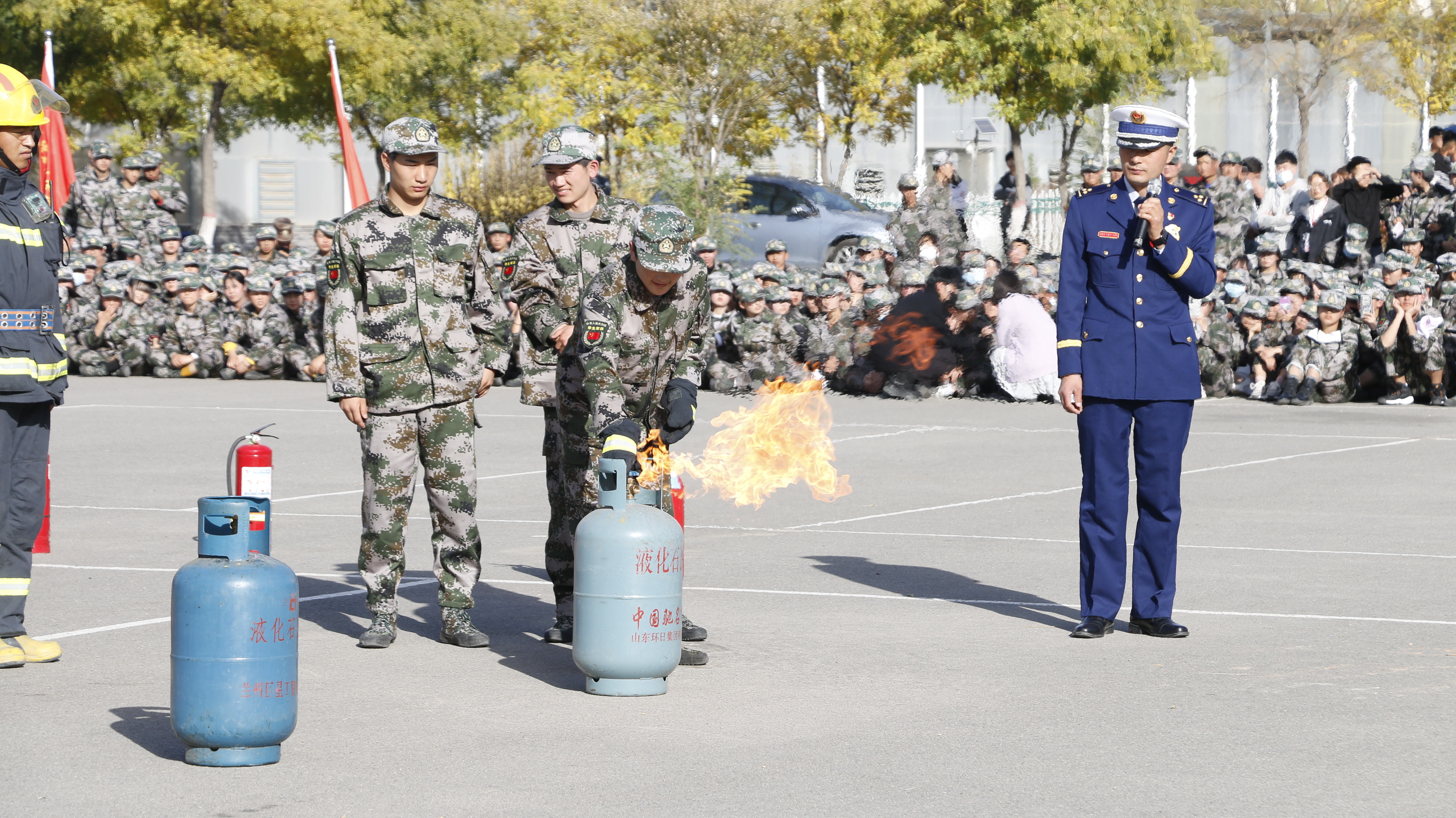 隨后,2020級全體新生整隊到操場參加了滅火演練。在消防救援中隊指戰(zhàn)員的講解和示范下,同學(xué)們學(xué)習(xí)了應(yīng)急逃生、火災(zāi)報警和滅火器使用等消防安全常識,學(xué)生代表體驗了處置液化氣瓶滅火、油鍋滅火、干粉滅火器滅火等操作,在實戰(zhàn)中提高了消防應(yīng)急能力。