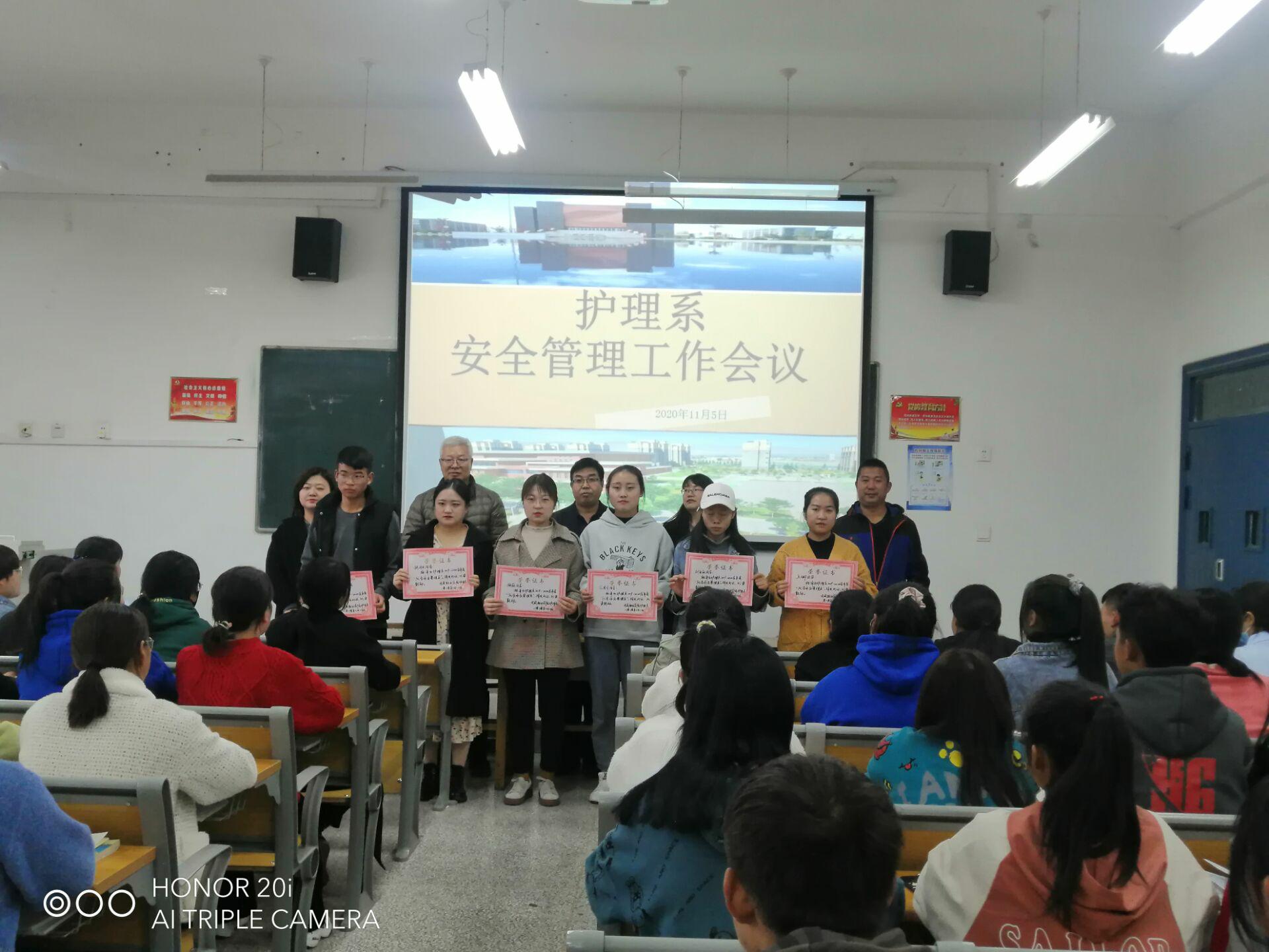 會上,陳鳳平宣讀了《護理系關(guān)于表彰2019-2020學(xué)年度學(xué)生優(yōu)秀安全管理員的決定》,護理系書記張建輝為獲表彰學(xué)生頒發(fā)榮譽證書。張學(xué)軍就近期我系存在的安全隱患問題作了詳細的說明。張建輝傳達了學(xué)院召開的疫情常態(tài)化防控工作會議內(nèi)容及相關(guān)文件精神,他指出,全系要進一步加強安全隱患排查,尤其是實驗室安全,切實將安全各項工作措施落到實處,預(yù)防安全事故的發(fā)生。他強調(diào),全系師生要進一步加強學(xué)生身體健康監(jiān)測,尤其是每天的晨午檢、日報告、零報告,切實將疫情防控各項工作措施落到實處;倡導(dǎo)文明就餐,增強節(jié)約意識,實施“光盤行動”,杜絕浪費發(fā)生; 持續(xù)做好宿舍、教室及環(huán)境衛(wèi)生掃除,營造良好的學(xué)習(xí)、生活和工作環(huán)境;安全是所有工作的基礎(chǔ)與保障,全體安全員要齊心協(xié)力、攜手努力,除隱患、防火險、保安全、促和諧,為建設(shè)美好校園戮力奮進。
