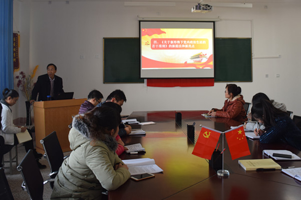 報(bào)告會重點(diǎn)從十八屆六中全會的重大成果及意義、為何聚焦“從嚴(yán)治黨”、十八屆六中全會為全面從嚴(yán)治黨做出的重要貢獻(xiàn)、《關(guān)于新形勢下黨內(nèi)政治生活的若干準(zhǔn)則》的新提法新亮點(diǎn)、《中國共產(chǎn)黨黨內(nèi)監(jiān)督條例》的新提法新亮點(diǎn)五個(gè)方面給師生做了解讀。