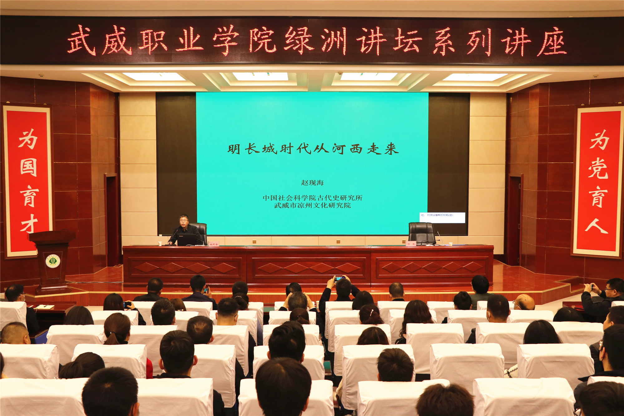 4月2日,學(xué)院綠洲講壇第40期開(kāi)講,由中國(guó)社會(huì)科學(xué)院古代史研究所研究員,明史研究室主任,市涼州文化研究院副院長(zhǎng)趙現(xiàn)海同志為師生進(jìn)行《明長(zhǎng)城時(shí)代從河西走來(lái)》的專(zhuān)題報(bào)告。學(xué)院領(lǐng)導(dǎo)、涼州文化研究院相關(guān)領(lǐng)導(dǎo)和工作人員,西關(guān)科技巷社區(qū)領(lǐng)導(dǎo)和學(xué)院師生代表220人參加了報(bào)告會(huì)。黨委委員、副院長(zhǎng)何毅主持報(bào)告會(huì)。