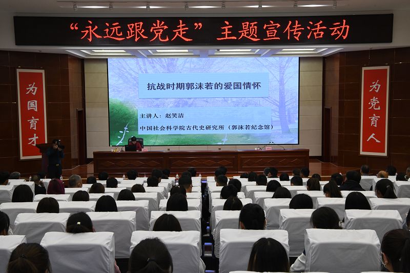 5月21日,中國社會(huì)科學(xué)院古代史研究所黨委書記、郭沫若紀(jì)念館原館長趙笑潔來學(xué)院作《抗戰(zhàn)時(shí)期郭沫若的愛國情懷》專題講座,學(xué)院在家院領(lǐng)導(dǎo)、副科級(jí)以上干部、師生代表共計(jì)220人聆聽了講座。
