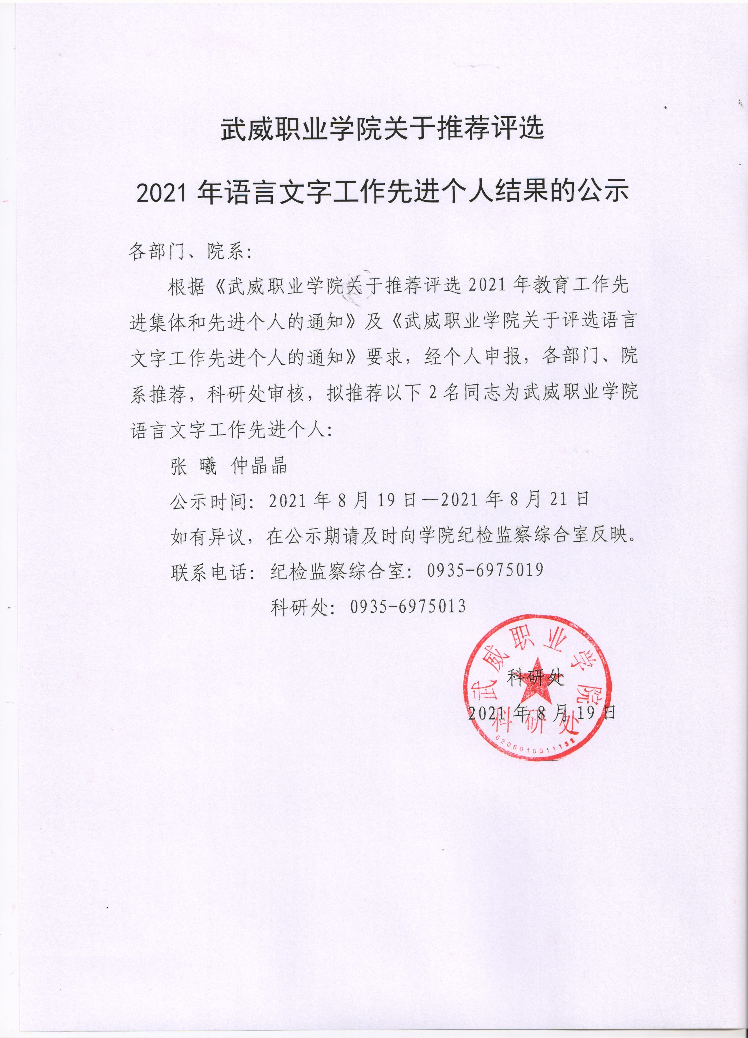 武威職業(yè)學院關(guān)于推薦評選2021年語言文字工作先進個人結(jié)果的公示