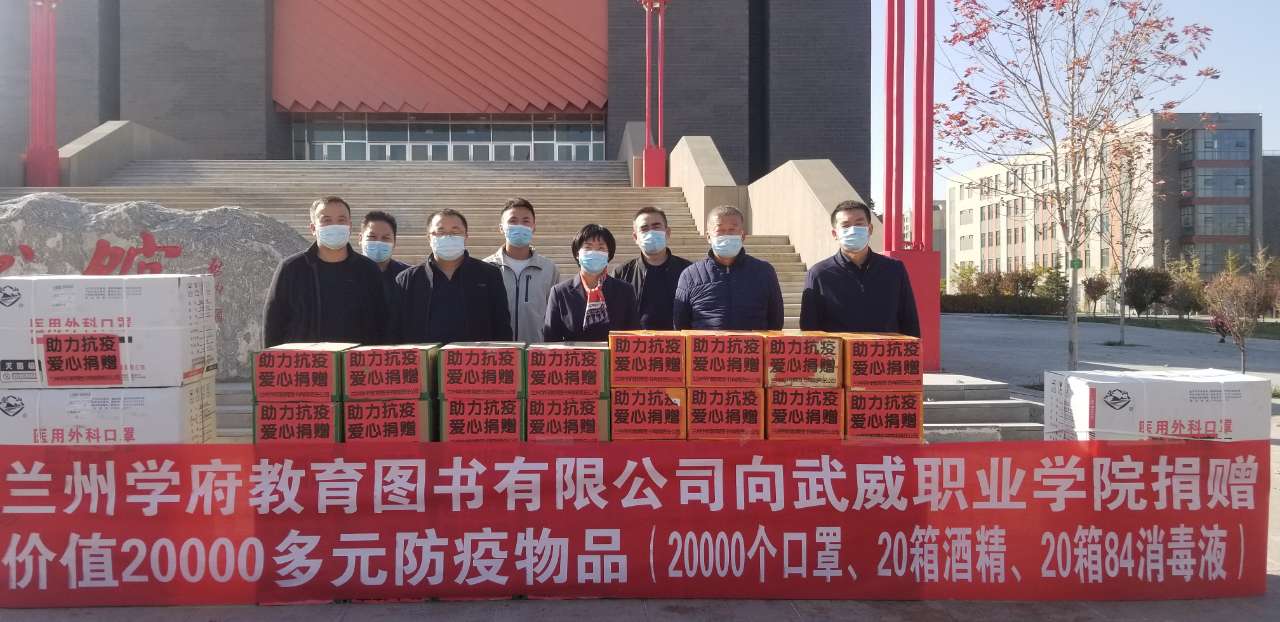 2021年11月4日,武威職業(yè)學(xué)院收到蘭州學(xué)府教育圖書有限公司捐贈(zèng)的價(jià)值20000多元防疫物品(20000個(gè)口罩、20箱酒精、20箱84消毒液)。學(xué)院黨委委員、副院長(zhǎng)何毅對(duì)蘭州學(xué)府教育圖書有限公司的慷慨贈(zèng)送表示感謝,對(duì)他們?cè)谖ky面前勇于擔(dān)當(dāng)、鼎力相助的善舉表示贊揚(yáng)。她說,目前學(xué)校疫情防控在即,消護(hù)物品儲(chǔ)備處于緊張狀態(tài),蘭州學(xué)府教育圖書有限公司雪中送炭、奉獻(xiàn)愛心,增強(qiáng)了我們打贏這場(chǎng)疫情防控阻擊戰(zhàn)的信心。