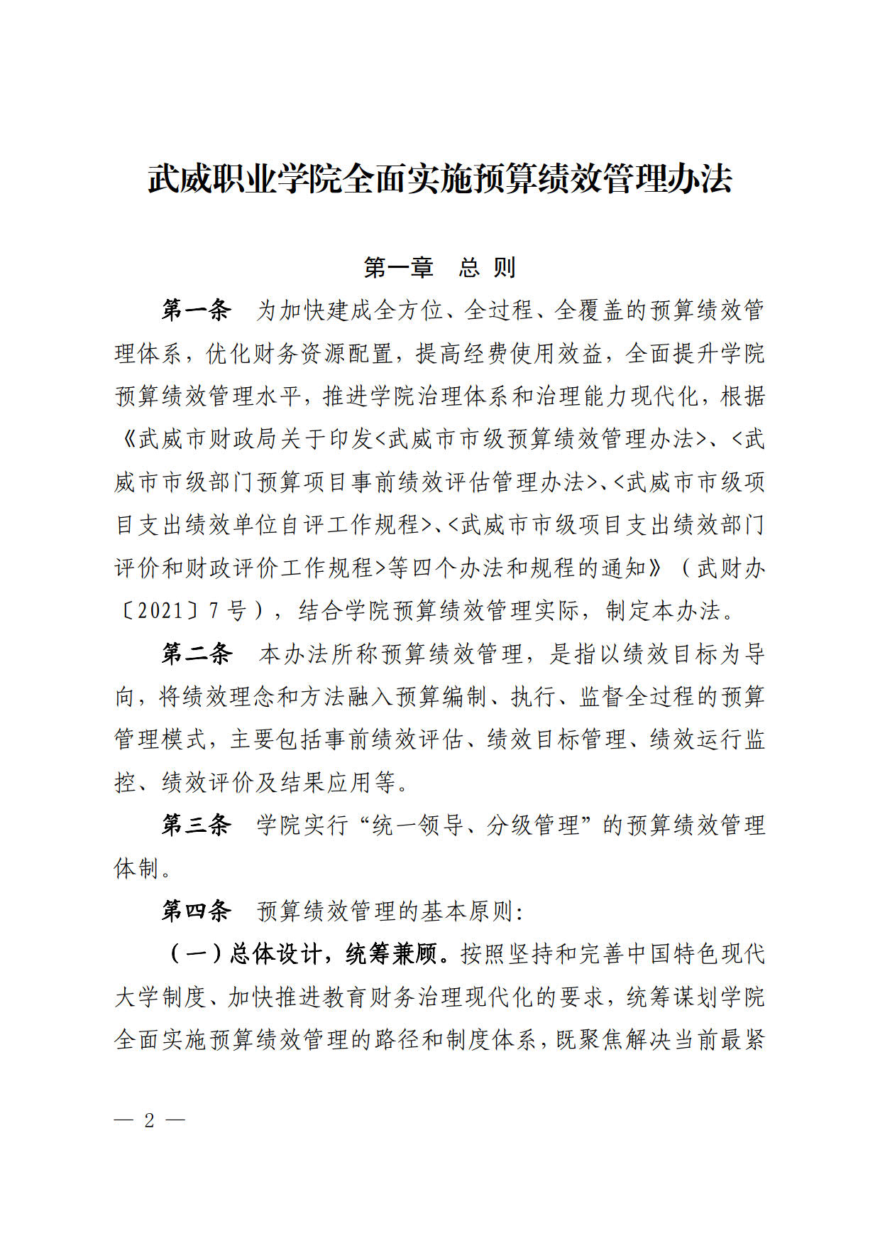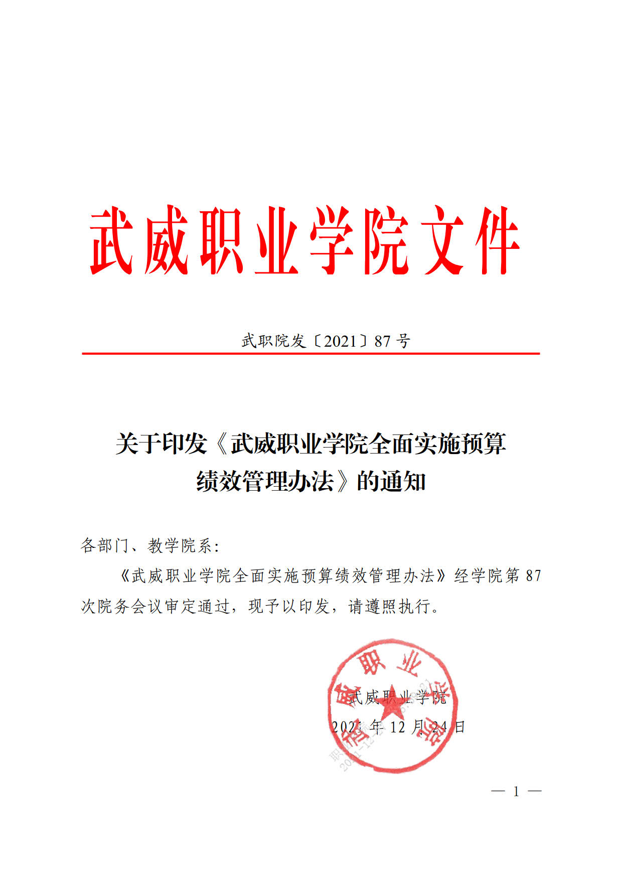 關(guān)于印發(fā)《武威職業(yè)學(xué)院全面實施預(yù)算績效管理辦法》的通知