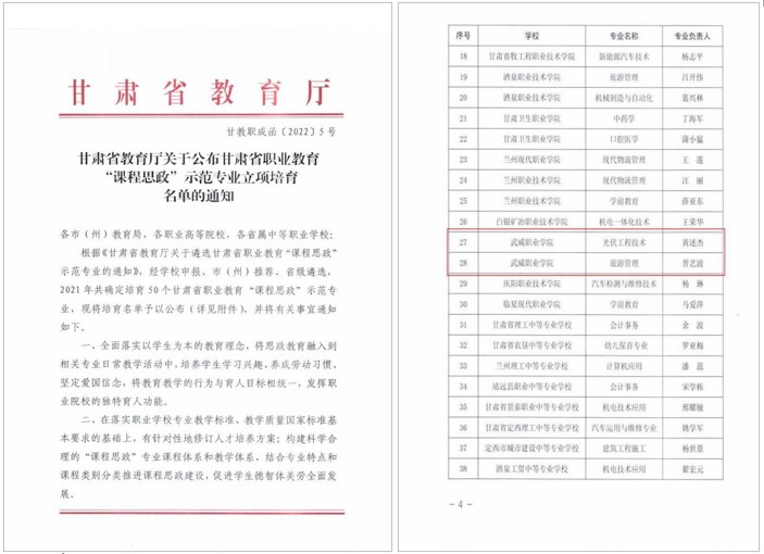 中科低碳新能源技術(shù)學(xué)院黃述杰負責的“光伏工程技術(shù)”和經(jīng)濟管理學(xué)院晉藝波負責的“旅游管理”2個專業(yè)獲評甘肅省職業(yè)教育“課程思政”示范專業(yè)。