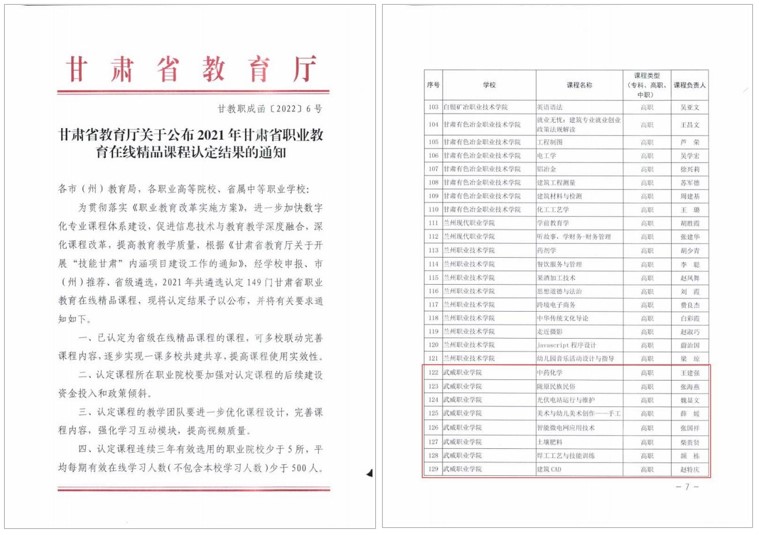 藥學(xué)院王建強負責的《中藥化學(xué)》、經(jīng)濟管理學(xué)院張海燕負責的《隴原民族民俗》、中科低碳新能源技術(shù)學(xué)院魏顯文負責的《光伏電站運行與維護》、張國祥負責的《智能微電網(wǎng)應(yīng)用技術(shù)》、藝術(shù)與教育學(xué)院薛媛負責的《美術(shù)與幼兒美術(shù)創(chuàng)作——手工》、現(xiàn)代農(nóng)業(yè)學(xué)院柴貴賢負責的《土壤肥料》、工程技術(shù)學(xué)院頡棟負責的《焊接工藝與技能訓(xùn)練》、趙特慶負責的《建筑CAD》8門課程獲評甘肅職業(yè)教育在線精品課程。