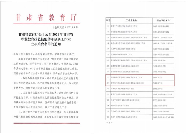 創(chuàng)新創(chuàng)業(yè)中心顏魯薪負責的“顏魯薪太陽能利用技藝技能傳承創(chuàng)新工作室”和藝術(shù)與教育學(xué)院藍明東負責的“藍明東傳統(tǒng)造型藝術(shù)技藝技能傳承創(chuàng)新工作室”獲評甘肅省職業(yè)教育技藝技能傳承創(chuàng)新工作室。
