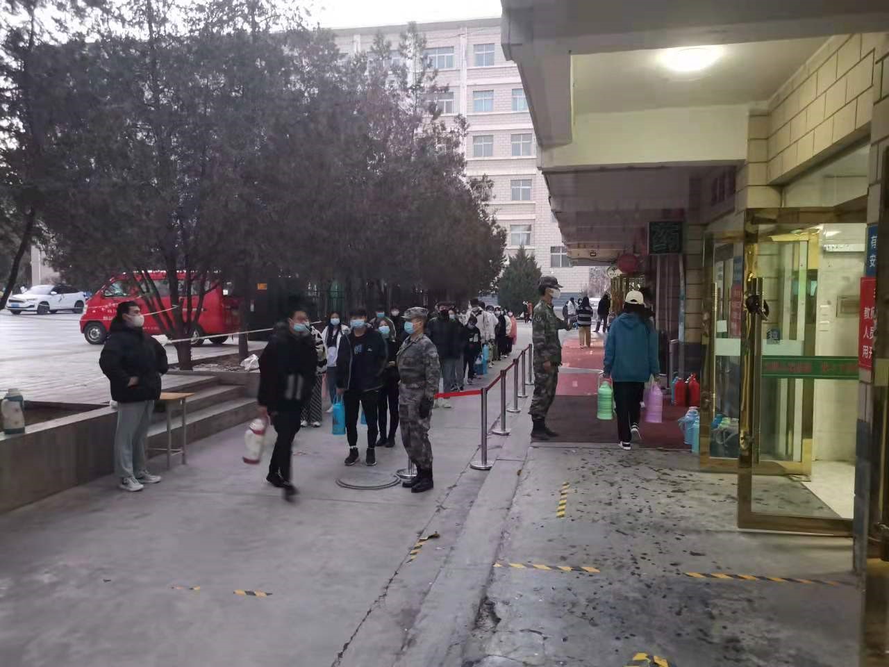 “同學(xué)們排隊(duì)時(shí)保持一米間距,不要聚集”“同學(xué)們上臺(tái)階的時(shí)候慢點(diǎn)走,注意腳下”,在堅(jiān)定而溫暖的提示下,同學(xué)們整整齊齊的排好了隊(duì)等待打開水。他就是藥學(xué)系2019級(jí)藥學(xué)3班學(xué)生,原武警北京總隊(duì)執(zhí)勤某支隊(duì)退伍士兵常路楊同學(xué),本次疫情爆發(fā)后,他帶領(lǐng)學(xué)校10名退伍同學(xué)呈遞《請(qǐng)戰(zhàn)書》,主動(dòng)請(qǐng)纓“抗疫”,參與到疫情防控工作中去,維護(hù)水房秩序、動(dòng)員同學(xué)們戴好口罩、有序排隊(duì)。進(jìn)入11月份以后,天氣越發(fā)的寒冷,但他們卻一如既往堅(jiān)守著自己的崗位,持續(xù)奉獻(xiàn)著自己的光和熱,“寒風(fēng)裂征衣,飛雪裹戰(zhàn)袍”,他們用實(shí)際行動(dòng)證明了中國軍人從來都不會(huì)后退。