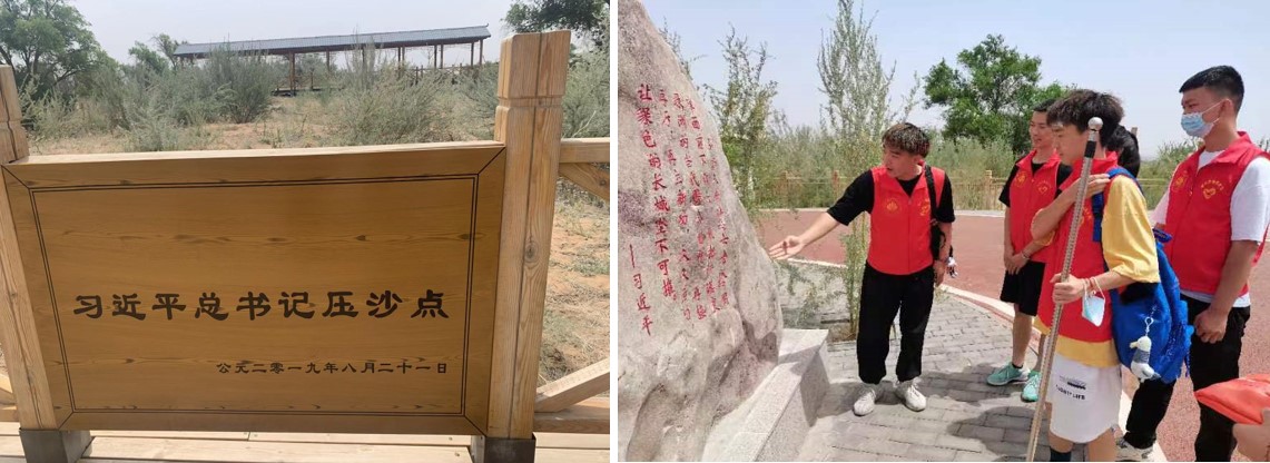 在兩山實踐基地負(fù)責(zé)人的指引下,我們參觀了習(xí)近平總書記曾經(jīng)到達(dá)過八步沙參與壓沙的目的地,認(rèn)真學(xué)習(xí)了習(xí)近平總書記在八步沙的講話精神,深刻領(lǐng)悟到了習(xí)近平總書記號召大家要弘揚(yáng)八步沙“六老漢”困難面前不低頭,敢把沙漠變綠洲的當(dāng)代愚公精神,在今后,我們將把這種精融入到實踐當(dāng)中,不負(fù)青春,不負(fù)韶華積極投身于祖國建設(shè)中。