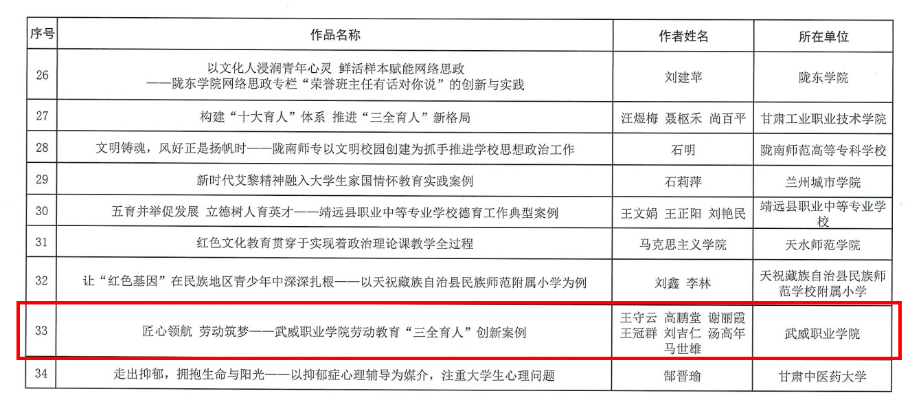 近日,2022年全省學校思想政治教育工作成果征集活動評選結(jié)果公布,武威職業(yè)學院喜獲佳績,兩件作品獲獎。其中,王守云、高鵬堂、謝麗霞、王冠群、劉吉仁、湯高年、馬世雄老師的《匠心領航 勞動筑夢—武威職業(yè)學院勞動教育“三全育人”創(chuàng)新案例》獲思想政治典型案例三等獎;張保海、馮文娟、謝麗霞老師的《基于“診改”的思政教育質(zhì)量評價體系構(gòu)建研究》獲思想政治論文三等獎。
