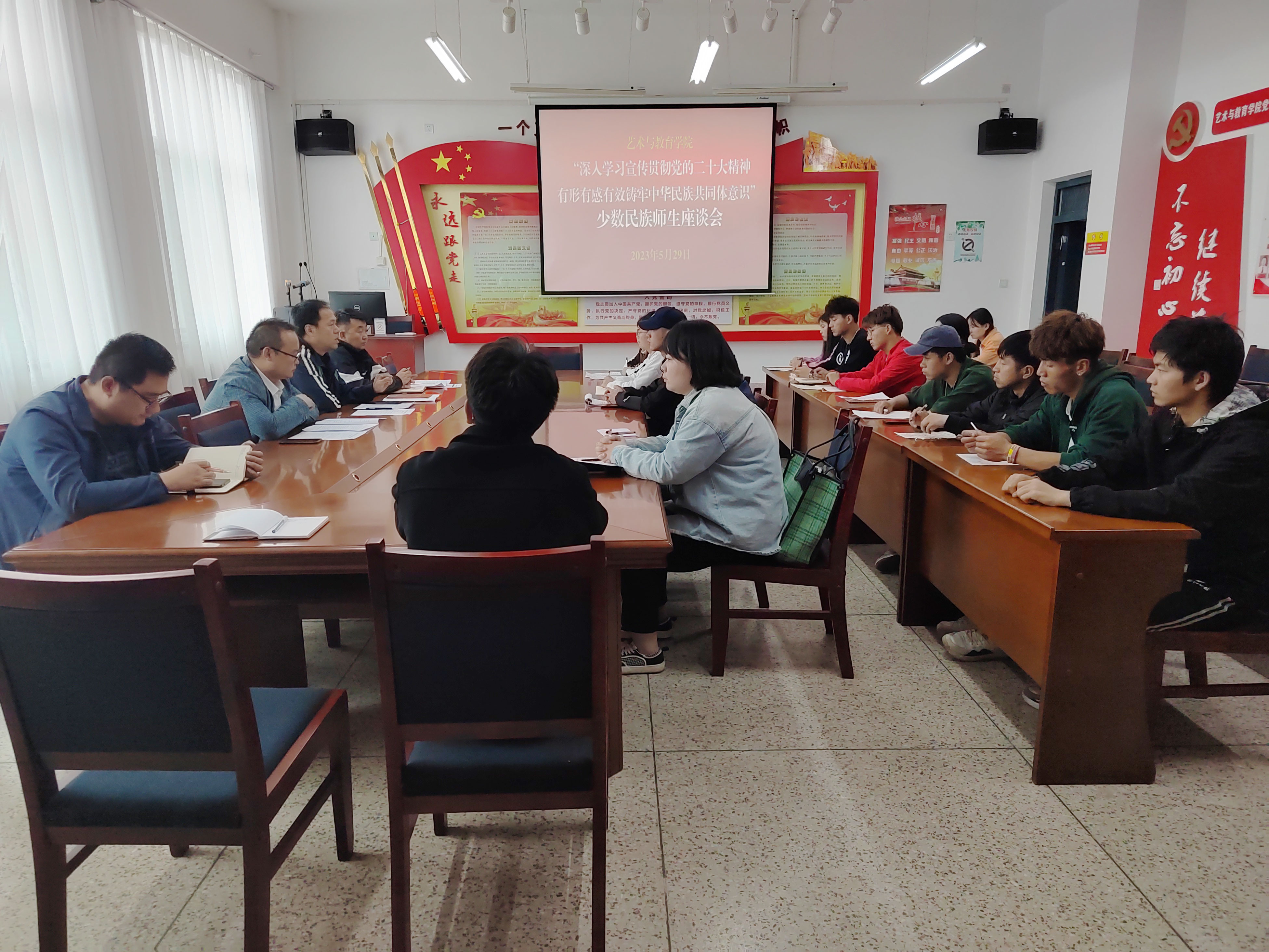 2023年5月29日下午,藝術(shù)與教育學(xué)院召開2023年第20個民族團(tuán)結(jié)進(jìn)步宣傳月各民族師生座談會,2022級各專業(yè)各民族學(xué)生代表,各民族師生代表和輔導(dǎo)員、班主任參加會議,會議由藝術(shù)與教育學(xué)院黨總支書記王政主持。