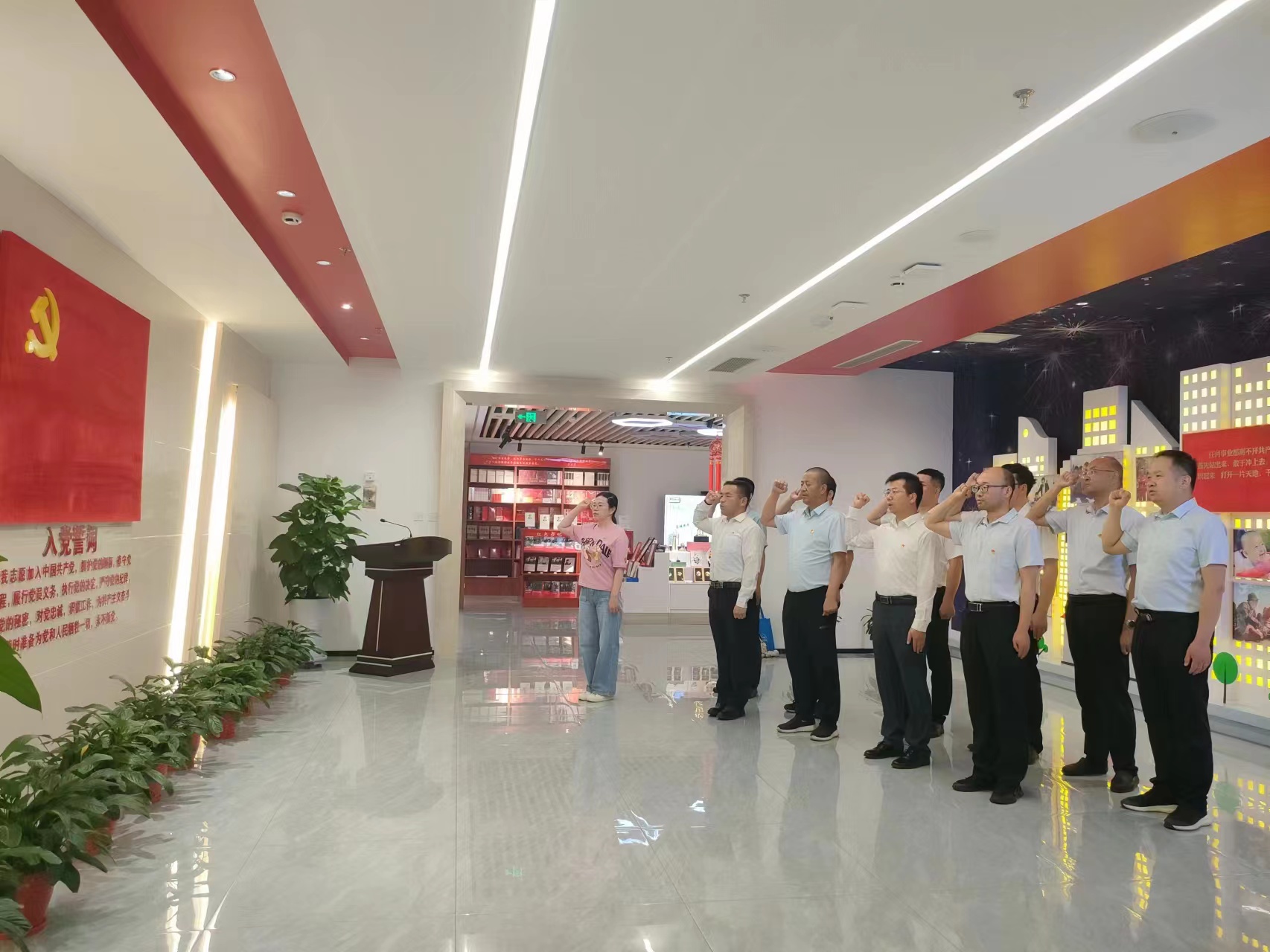 參觀結(jié)束后,在鮮紅的黨旗下,全體黨員舉起右拳,重溫入黨誓詞。一句句鏗鏘的誓言、一個個緊握的拳頭、一枚枚閃亮的黨徽,深情表達著對黨的無限熱愛和聽黨話、感黨恩的決心。