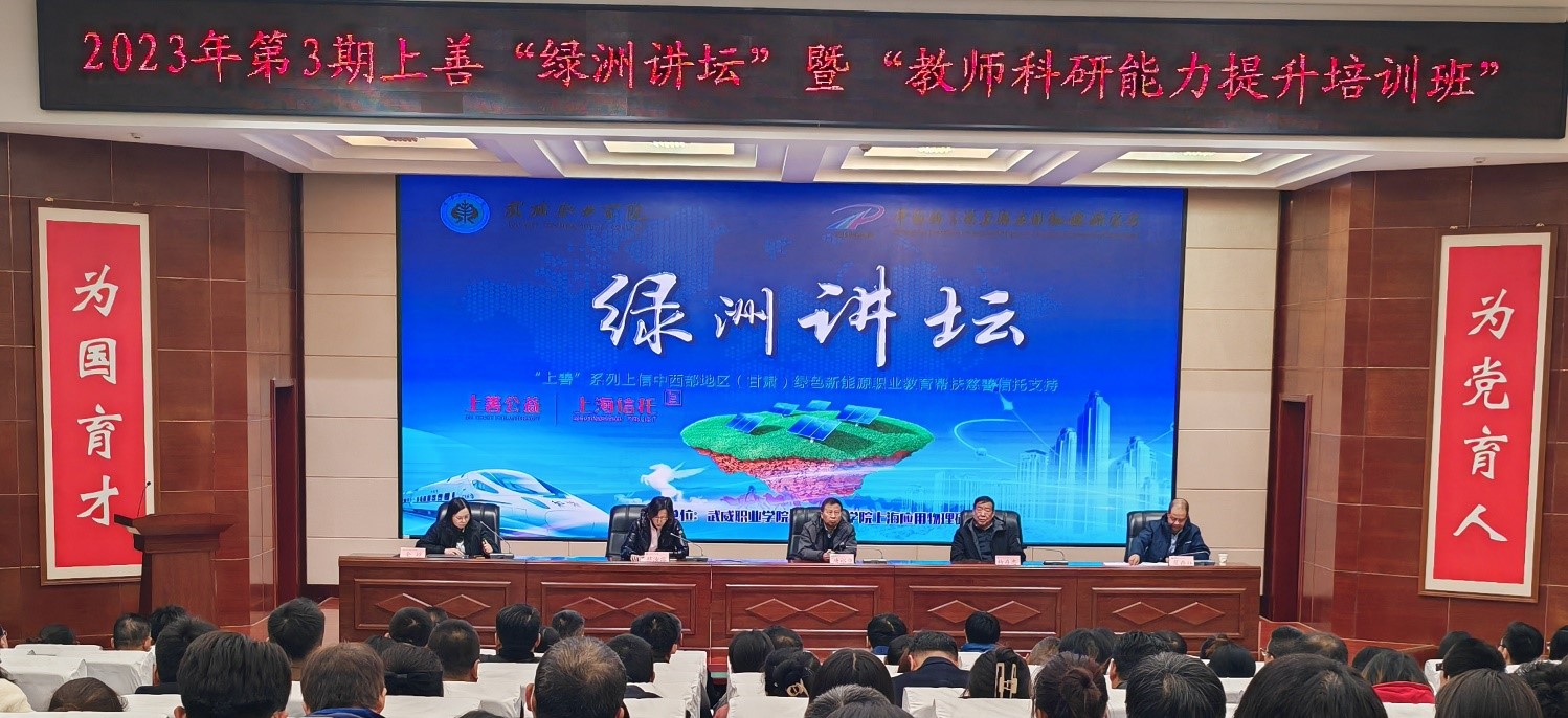 為進(jìn)一步深入學(xué)習(xí)貫徹黨的二十大精神,落實(shí)中共中央辦公廳、國務(wù)院辦公廳印發(fā)的《關(guān)于深化現(xiàn)代職業(yè)教育體系建設(shè)改革的意見》精神,切實(shí)開展“科教融匯、產(chǎn)教融合”,2023年11月10日,武威職業(yè)學(xué)院2023年第3期上善“綠洲講壇”學(xué)術(shù)報(bào)告會(huì)暨“教師科研能力提升培訓(xùn)班”在學(xué)校菁英廳開講。原中科院上海應(yīng)用物理研究所黨委書記唐裕華;上海應(yīng)物所高級(jí)教育顧問,中科低碳新能源技術(shù)學(xué)院院長楊存忠教授;“上善”慈善信托公司總經(jīng)理蔡汝溶;核工業(yè)第八研究所王伊馨博士、王夢千博士、何炳余博士、王后全博士;上海應(yīng)物所副研究員,中科低碳新能源技術(shù)學(xué)院院長助理金嬋博士;全體在家校領(lǐng)導(dǎo)出席此次報(bào)告會(huì),教師代表共200人參會(huì),此次報(bào)告會(huì)由武威職業(yè)學(xué)院黨委副書記翟存祥教授主持。