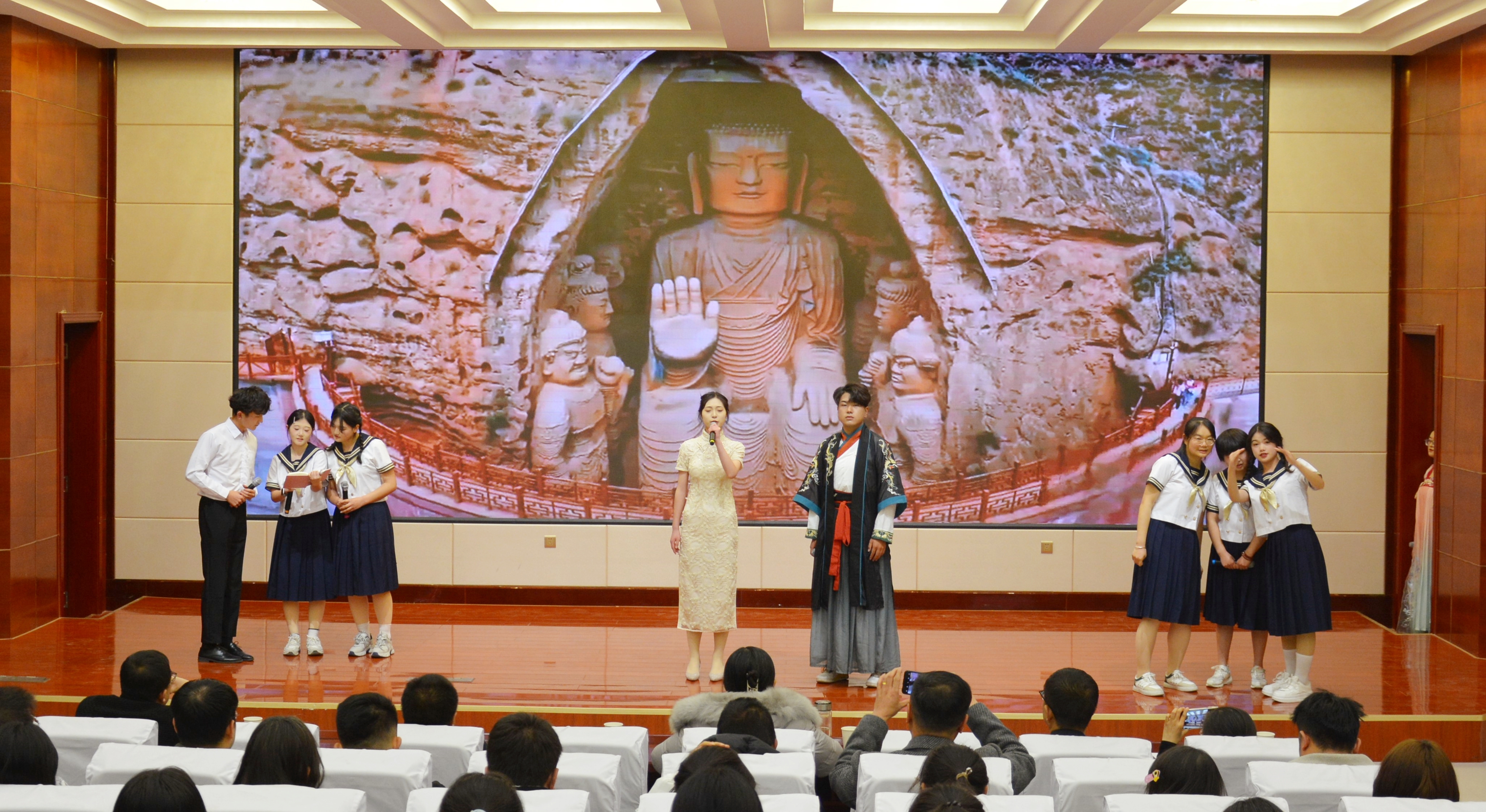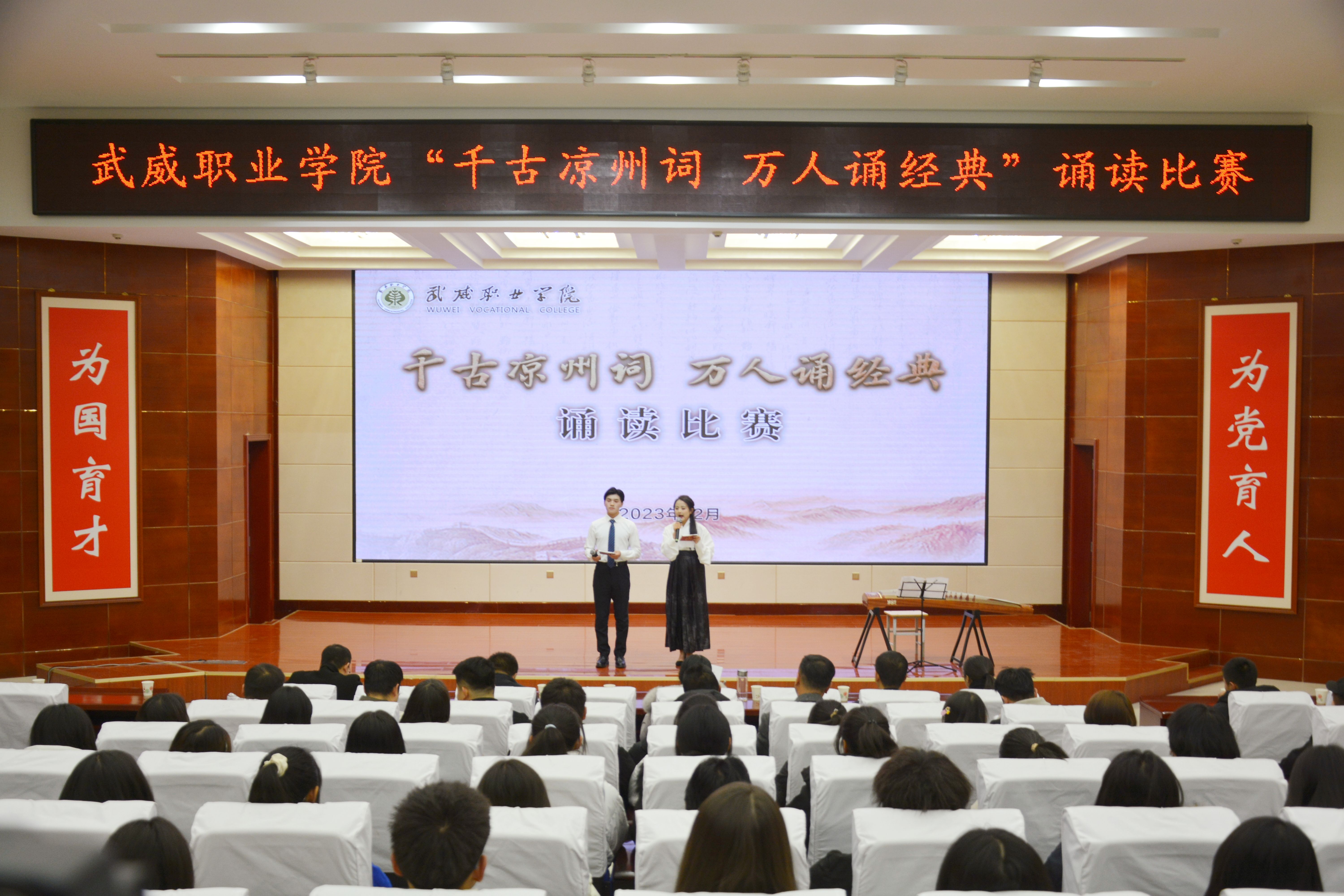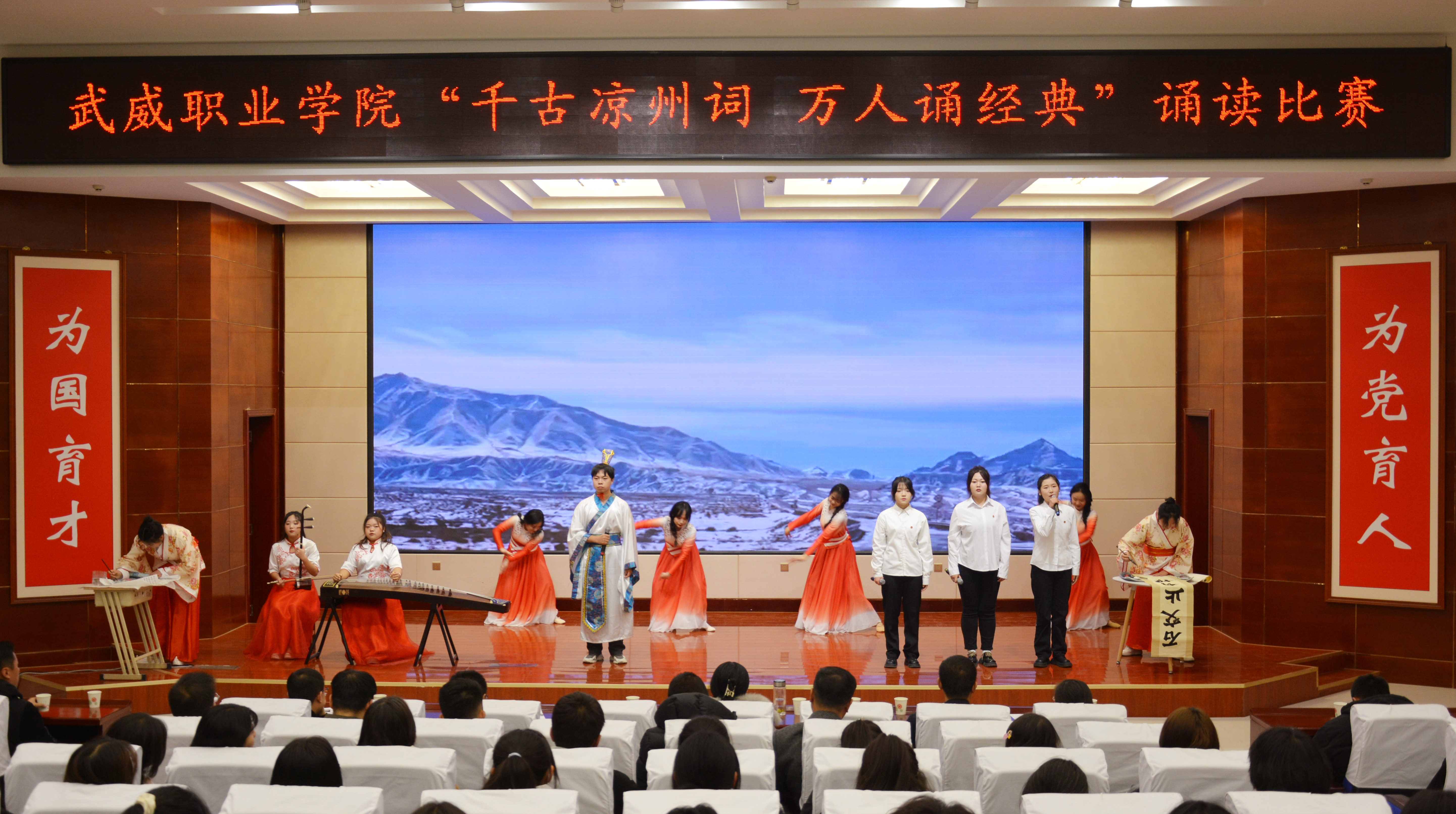 比賽現(xiàn)場(chǎng)精彩紛呈,現(xiàn)場(chǎng)氣氛異常熱烈,掌聲此起彼伏。節(jié)目以詩(shī)歌吟誦、伴舞、書(shū)法、國(guó)畫(huà)、武術(shù)、情景表演等豐富多彩的藝術(shù)形式,為現(xiàn)場(chǎng)觀眾打造出一場(chǎng)別開(kāi)生面的涼州文化視聽(tīng)盛宴。同學(xué)們激情洋溢,用澎湃真摯的情感演繹著經(jīng)典燦爛的磅礴詩(shī)篇,用跨越千年的對(duì)話(huà)勾勒出雄渾壯烈的漢武雄風(fēng),用鏗鏘有力的旋律編織出蕩氣回腸的時(shí)代頌歌,以青春奮斗的初心賡續(xù)著生生不息的五涼文化。