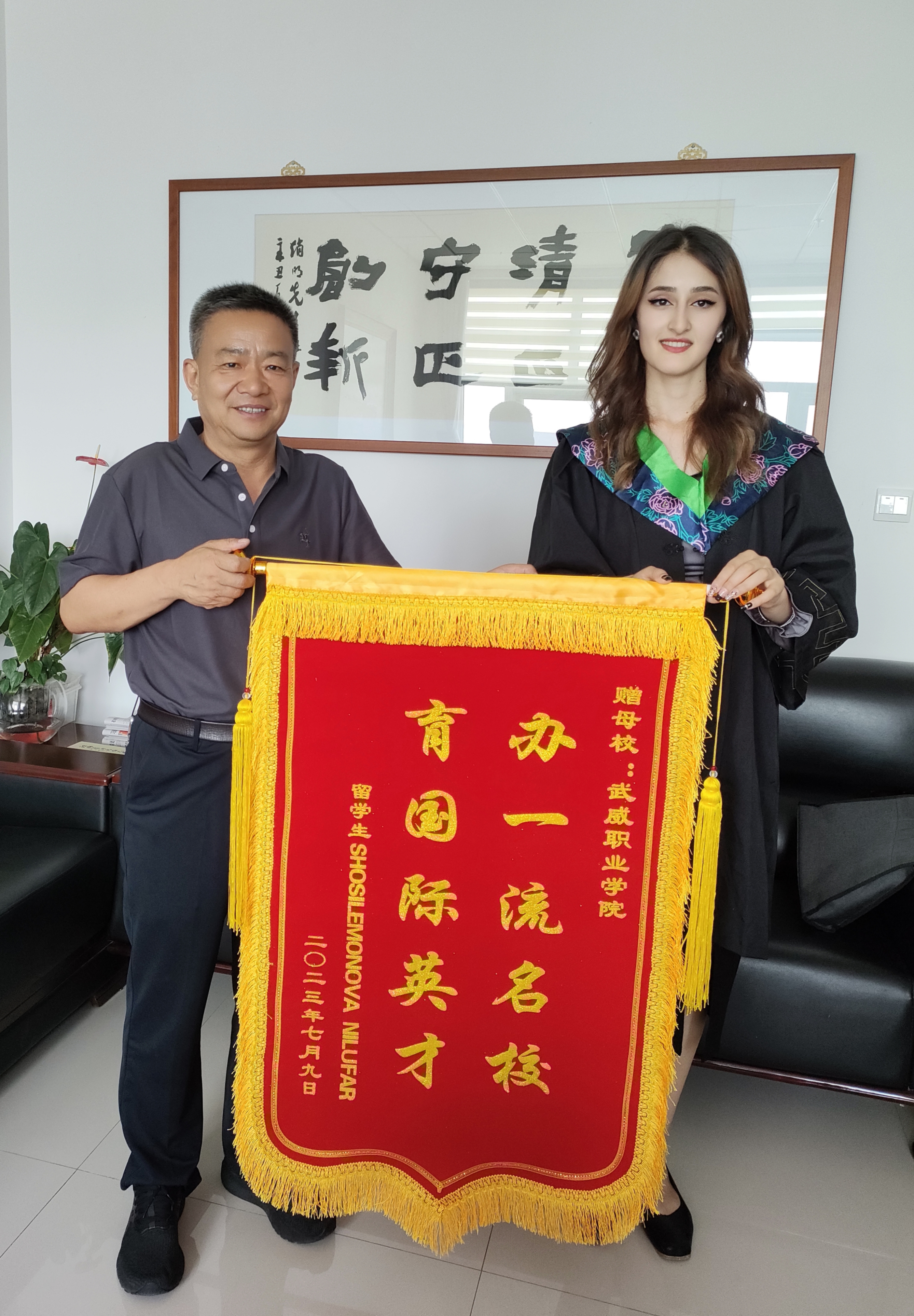 國際學(xué)生HOSILEMONOVA NILUFAR(妮娜)向?qū)W校贈(zèng)送“辦一流名校 育國際英才”的感謝旌旗,對學(xué)校精心、悉心培養(yǎng)自己表達(dá)了由衷的感謝,表示在武威職業(yè)學(xué)院收獲了專業(yè)技能和人生閱歷,接觸到了先進(jìn)技術(shù)技能和前沿思想,特別是通過學(xué)習(xí)中國文化,深刻認(rèn)識到文化交流的重要性,也更加堅(jiān)定了自己繼續(xù)學(xué)習(xí)中文和中國文化的決心。