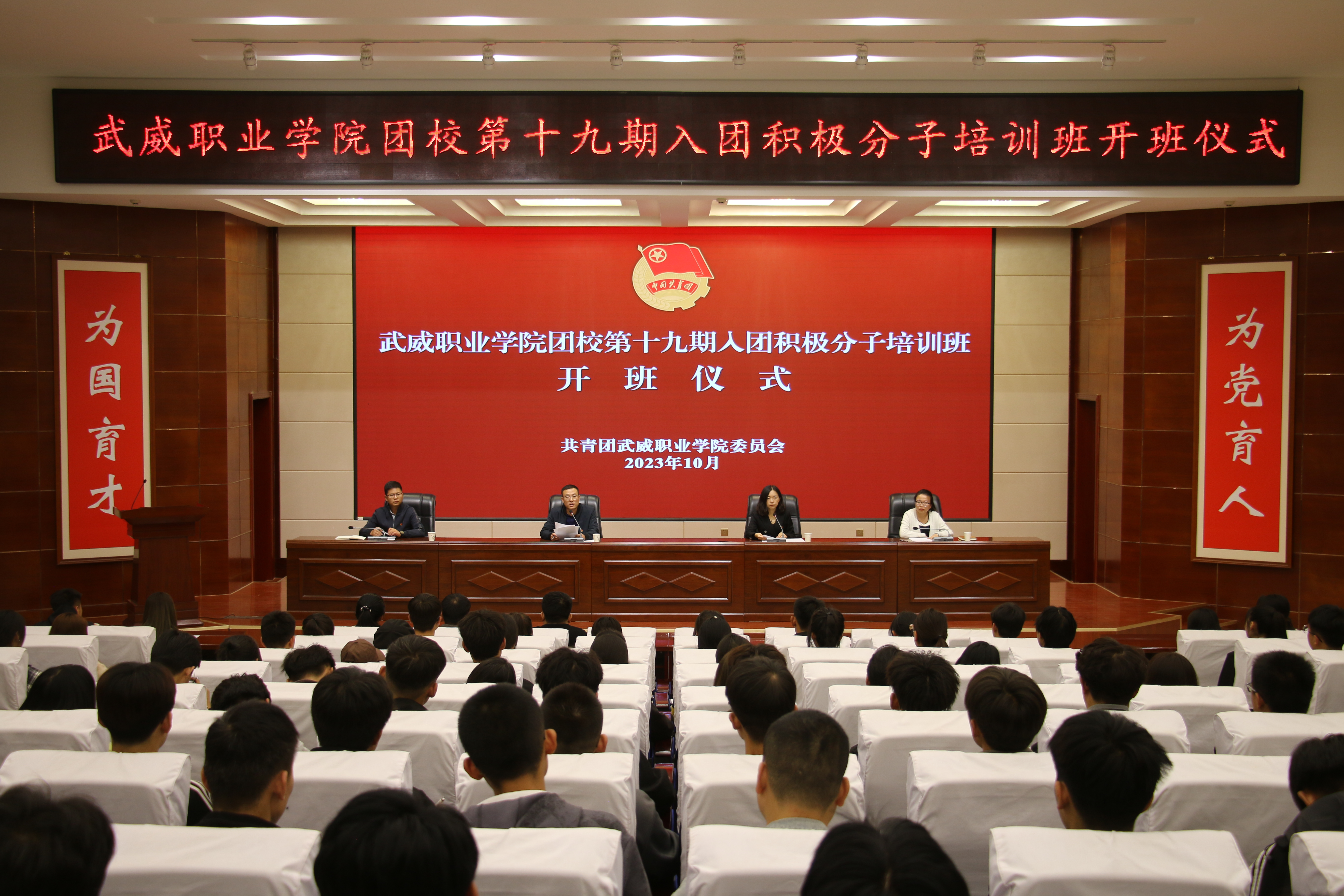 10月9日下午,學(xué)校團(tuán)校第十九期入團(tuán)積極分子培訓(xùn)班在菁英廳舉行開(kāi)班儀式。校團(tuán)委全體干部、二級(jí)學(xué)院團(tuán)委書(shū)記及182名入團(tuán)積極分子培訓(xùn)班學(xué)員參加開(kāi)班儀式。儀式由校團(tuán)委副書(shū)記謝麗霞主持。
