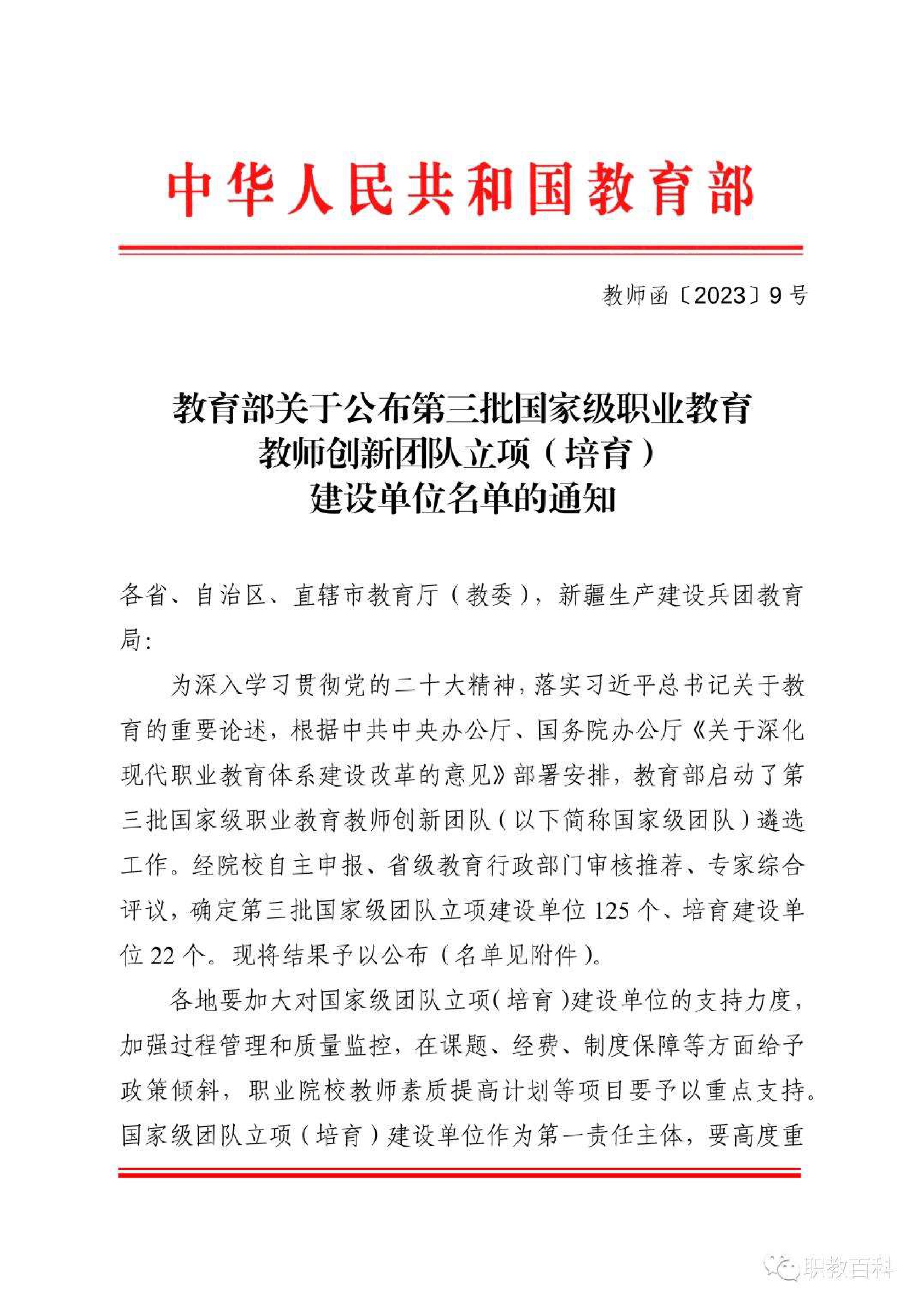 近日,教育部公布了《教育部關(guān)于公布第三批國家級職業(yè)教育教師創(chuàng)新團隊立項(培育)建設(shè)單位名單的通知》(教師函〔2023〕9號),學(xué)院黃述杰教授主持的“光伏工程技術(shù)”專業(yè)教師團隊成功入選。這是學(xué)校首次入選國家級職業(yè)教育教師創(chuàng)新團隊立項建設(shè)單位,實現(xiàn)了學(xué)校教學(xué)團隊“國家級”項目零的突破,也是學(xué)校“雙高”項目建設(shè)和高質(zhì)量發(fā)展中取得的又一項國家級標(biāo)志性成果。
