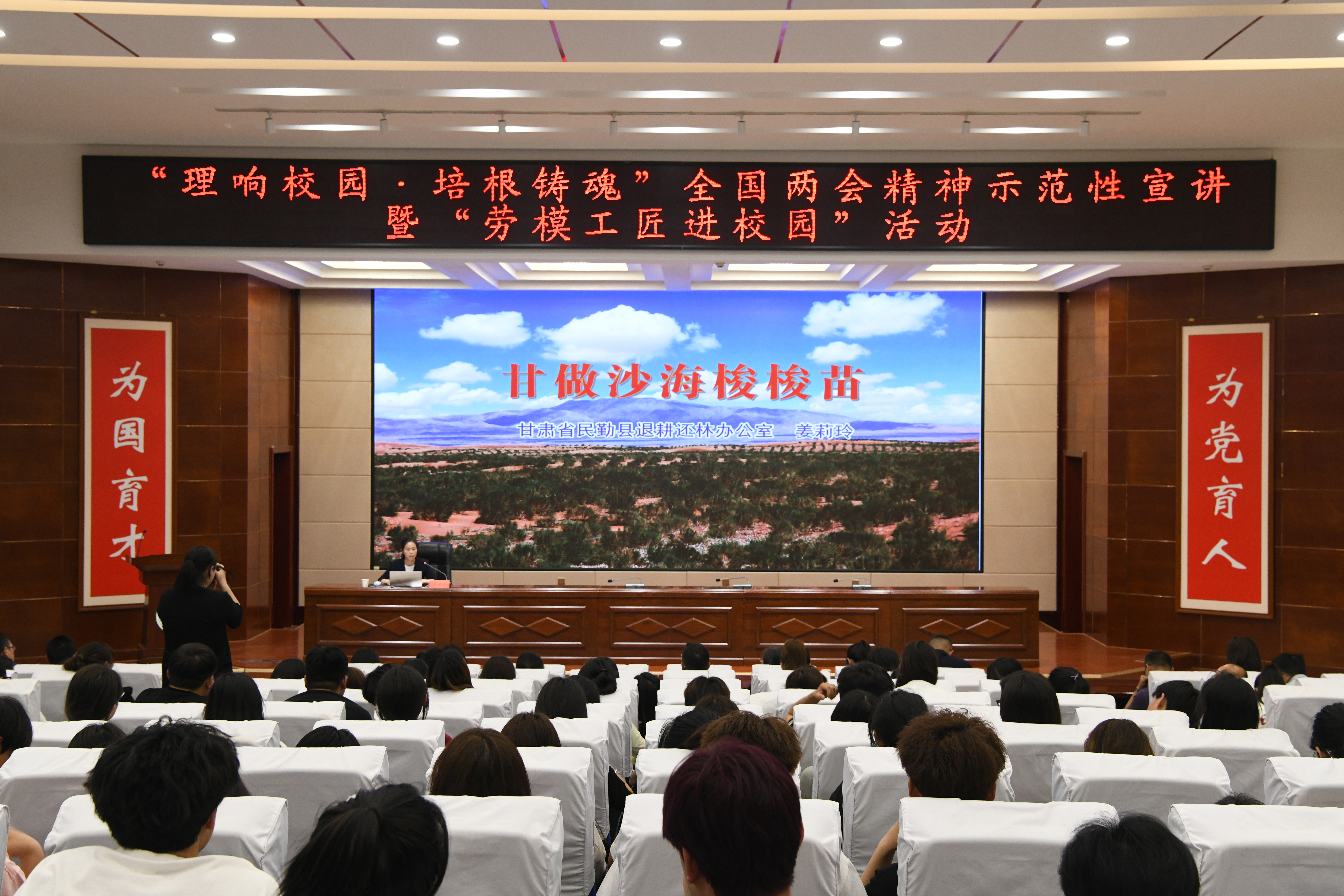 為全面深入學(xué)習(xí)領(lǐng)會習(xí)近平總書記在全國兩會期間發(fā)表的一系列重要講話精神以及全國兩會審議通過的報告和文件精神,根據(jù)省委教育工委、省總工會有關(guān)要求,5月20日上午,甘肅省“理響校園·培根鑄魂”全國兩會精神示范性宣講暨“勞模工匠進校園”活動武威職業(yè)學(xué)院專場,在學(xué)校學(xué)生發(fā)展中心菁英廳舉行。學(xué)校邀請?zhí)m州理工大學(xué)馬克思主義學(xué)院教授王海霞,武威民勤退耕還林辦公室主任、甘肅省五一巾幗獎?wù)芦@得者姜莉玲,蘭州理工大學(xué)經(jīng)管學(xué)院學(xué)生白玲玲來學(xué)校宣講。學(xué)校黨委委員、副校長何毅,宣傳統(tǒng)戰(zhàn)部負(fù)責(zé)人、師生代表共200余人參加宣講會。宣講會由何毅主持。