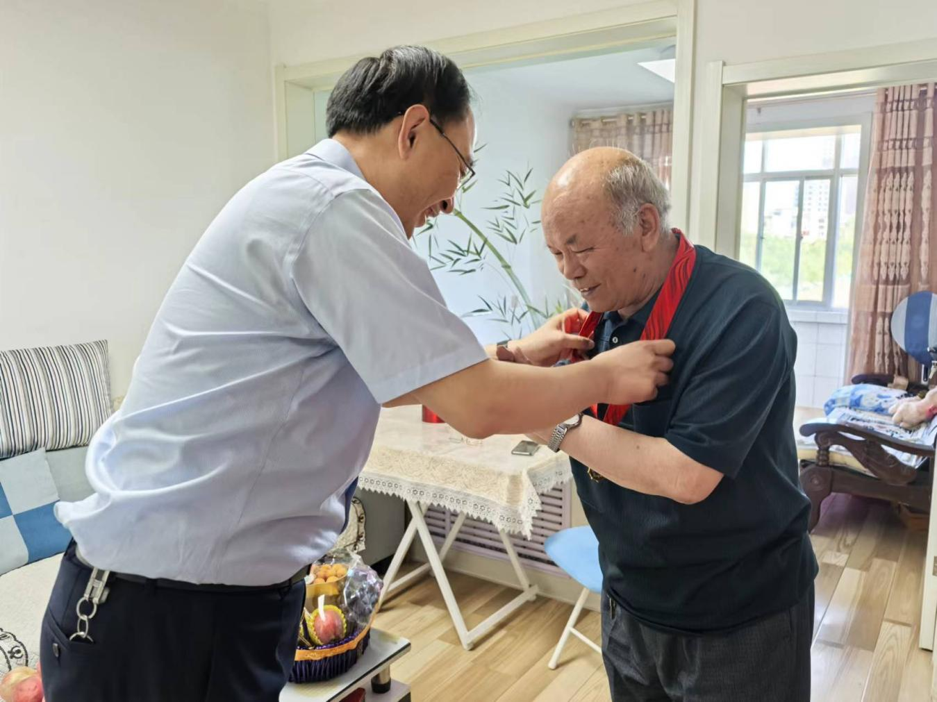 在擁有50年黨齡的退休教師秦光善家中,黨委書記王宏為他頒發(fā)了“光榮在黨50年”紀(jì)念章,并表達(dá)了深深的感謝,同時叮囑他要保重身體,遇到困難及時向組織反映。