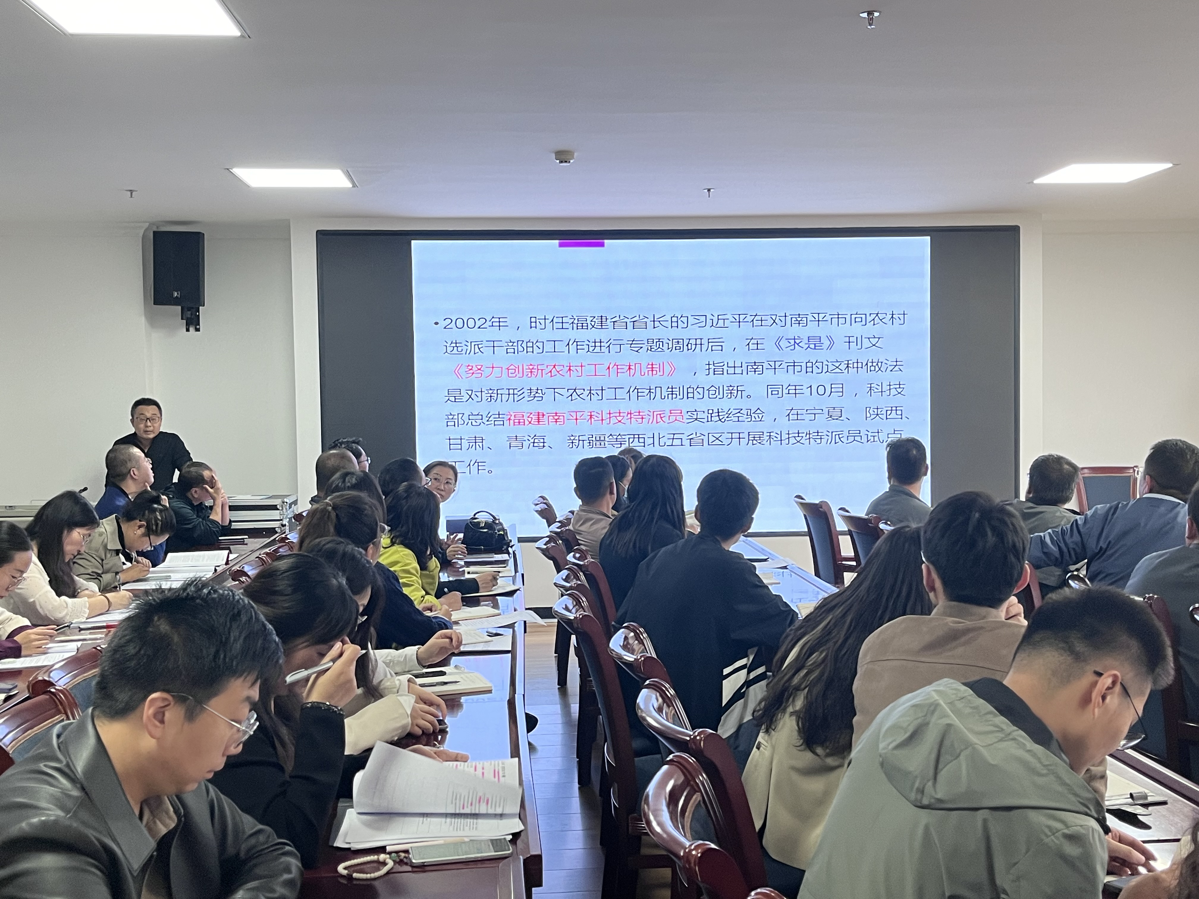 首先,科技處處長(zhǎng)蔡柱山帶領(lǐng)科技特派員及全體工作人員學(xué)習(xí)了《習(xí)近平總書(shū)記關(guān)于科技特派員工作指示精神摘錄》《武威市科技特派員管理辦法》《武威市2024年科技特派員工作要點(diǎn)》《武威職業(yè)學(xué)院科技特派員、“三區(qū)”科技人才管理辦法》等文件精神。會(huì)議開(kāi)展了交流活動(dòng),現(xiàn)場(chǎng)氣氛活躍,互動(dòng)頻繁。4名科技特派員優(yōu)秀代表發(fā)言,分享了自己在科技服務(wù)中的收獲感想,激勵(lì)大家持續(xù)開(kāi)展科技服務(wù)工作,增強(qiáng)做好科技特派員工作的責(zé)任感和使命感。最后,蔡柱山作總結(jié)講話(huà),提出了工作要求及希望,指出各位科技特派員和“三區(qū)”科技人才要加強(qiáng)理論學(xué)習(xí),不斷提升科技服務(wù)能力;要堅(jiān)持創(chuàng)新實(shí)踐,全力推進(jìn)工作走深走實(shí);要強(qiáng)化示范引領(lǐng),努力打造典型科技創(chuàng)新支撐能力。