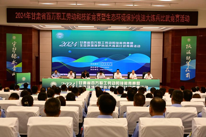 9月3日上午,由甘肅省生態(tài)環(huán)境廳、甘肅省總工會、甘肅省婦女聯(lián)合會主辦,武威市生態(tài)環(huán)境局協(xié)辦的甘肅省生態(tài)環(huán)境保護(hù)執(zhí)法大練兵比武競賽活動在學(xué)校菁英廳開幕,甘肅省生態(tài)環(huán)境廳副廳長劉文璽、省司法廳副廳長何雯、省婦聯(lián)一級巡視員崔海華、武威市人民政府副市長陳一夫、市生態(tài)局局長張有恒、學(xué)校黨委書記王宏、校長、黨委副書記張開禮,省生態(tài)環(huán)境廳、省總工會、省婦聯(lián)、省司法廳、武威市人民政府有關(guān)領(lǐng)導(dǎo),省生態(tài)環(huán)境廳機(jī)關(guān)處室、直屬單位相關(guān)負(fù)責(zé)同志,武威市生態(tài)環(huán)境局、學(xué)??荚嚺嘤?xùn)中心等單位負(fù)責(zé)同志共100余人參加了開幕式。