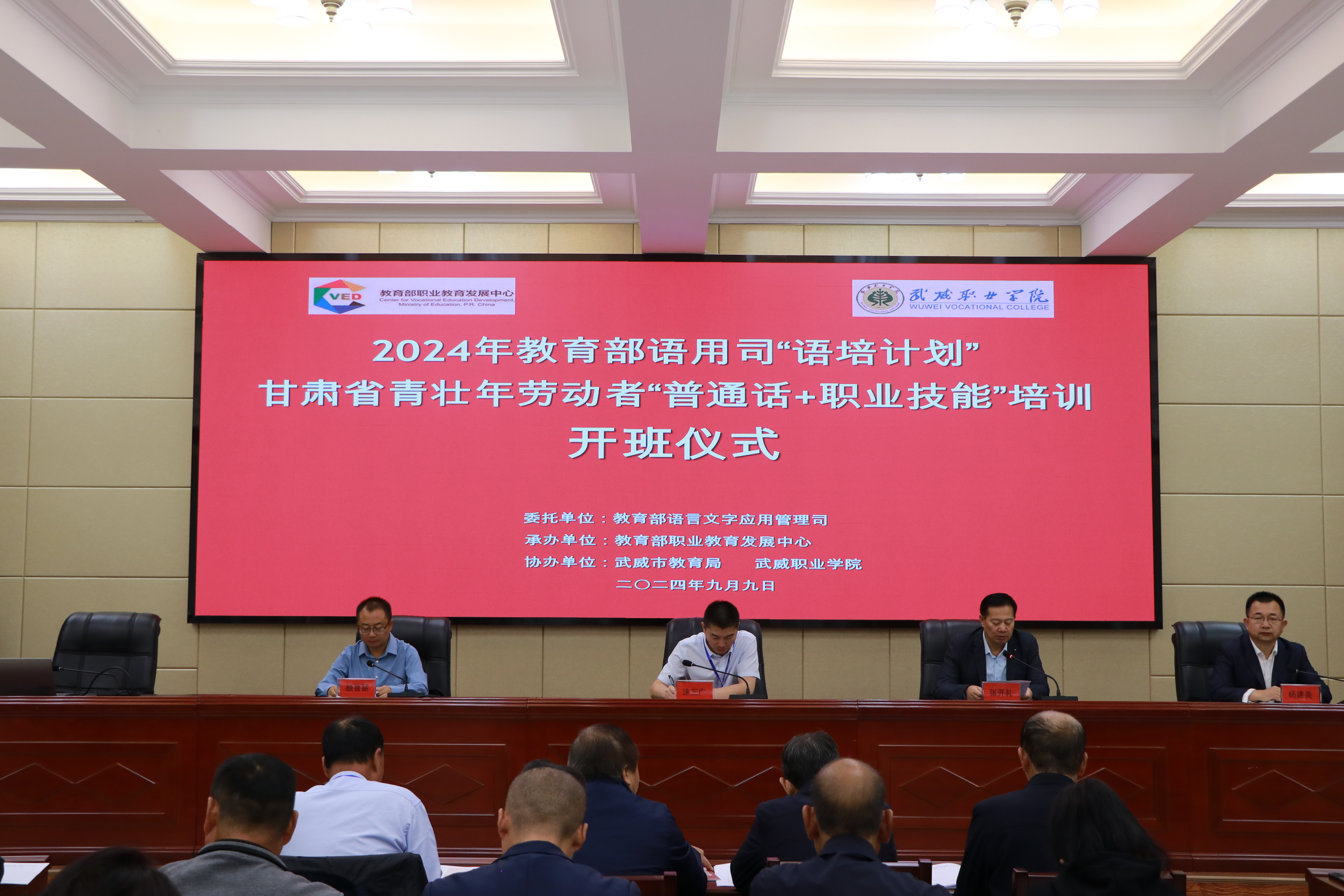 9月9日上午,2024年教育部語(yǔ)用司“語(yǔ)培計(jì)劃”甘肅省青壯年勞動(dòng)者“普通話+職業(yè)技能”培訓(xùn)班在我校正式開班。本次培訓(xùn)是深入貫徹黨的二十大精神和二十屆三中全會(huì)精神,根據(jù)教育部語(yǔ)用司《關(guān)于實(shí)施2024年國(guó)家通用語(yǔ)言文字示范性培訓(xùn)計(jì)劃的通知》,受教育部語(yǔ)用司委托,由教育部職業(yè)教育發(fā)展中心承辦、武威市教育局、學(xué)校共同協(xié)辦。本次培訓(xùn)為期5天,共有來(lái)自武威市三縣一區(qū)的50余名學(xué)員參加。培訓(xùn)以“語(yǔ)言鋪路,技能致富”為主題,培訓(xùn)內(nèi)容聚焦當(dāng)?shù)剞r(nóng)業(yè)種植技術(shù)技能和畜牧業(yè)養(yǎng)殖技能開展,以古浪“紅禿頭”小麥、民勤蜜瓜等特色農(nóng)產(chǎn)品的栽培養(yǎng)殖技術(shù)為主線,設(shè)計(jì)了“普通話+職業(yè)技能”為主題的課程內(nèi)容,邀請(qǐng)了國(guó)家級(jí)普通話測(cè)試員、甘肅省農(nóng)業(yè)科學(xué)院專家、武威市農(nóng)科所專家等組成的專家團(tuán)隊(duì)。